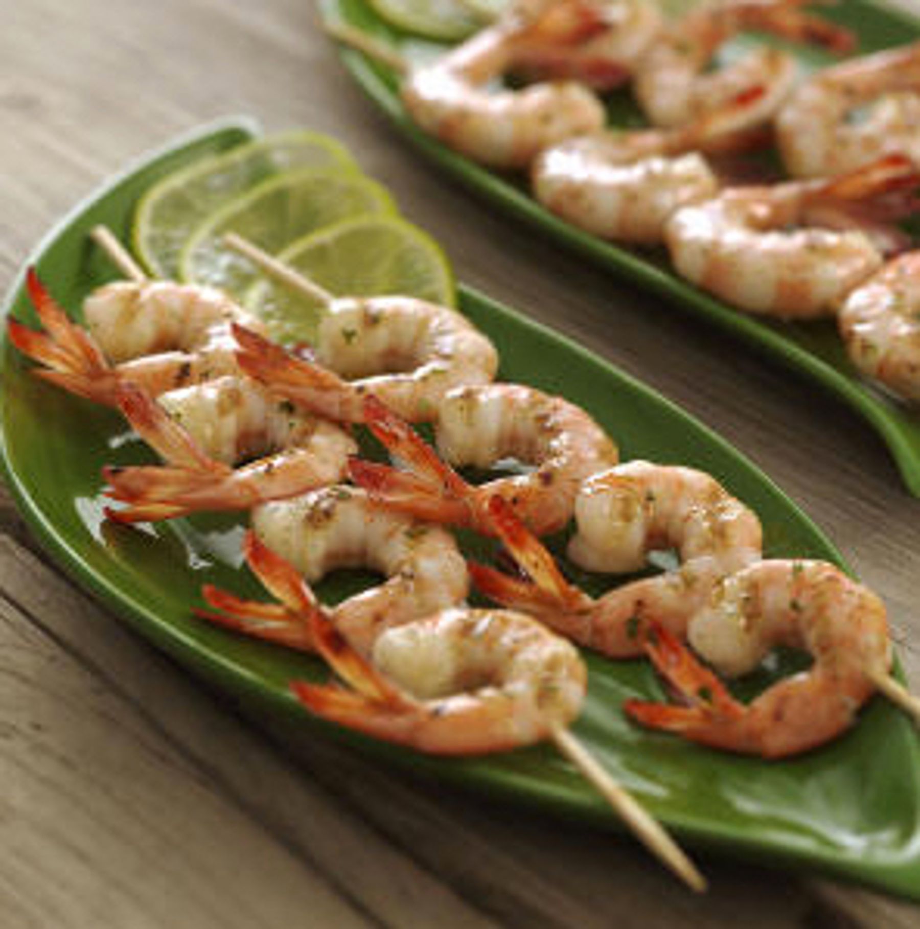 Coat grill rack with nonstick cooking spray before starting the grill. Drain and discard marinade. Thread shrimp onto eight metal skewers.
