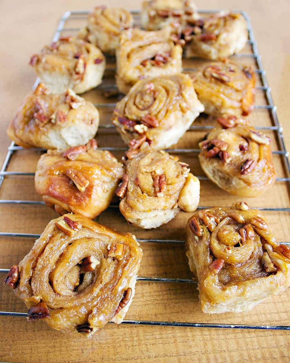 Bread dough is rolled up with a cinnamon and orange sugar mixture, baked in a honey and pecan glaze, and flipped while still warm to keep these Honey Orange Pecan Sticky Buns moist and flavorful.