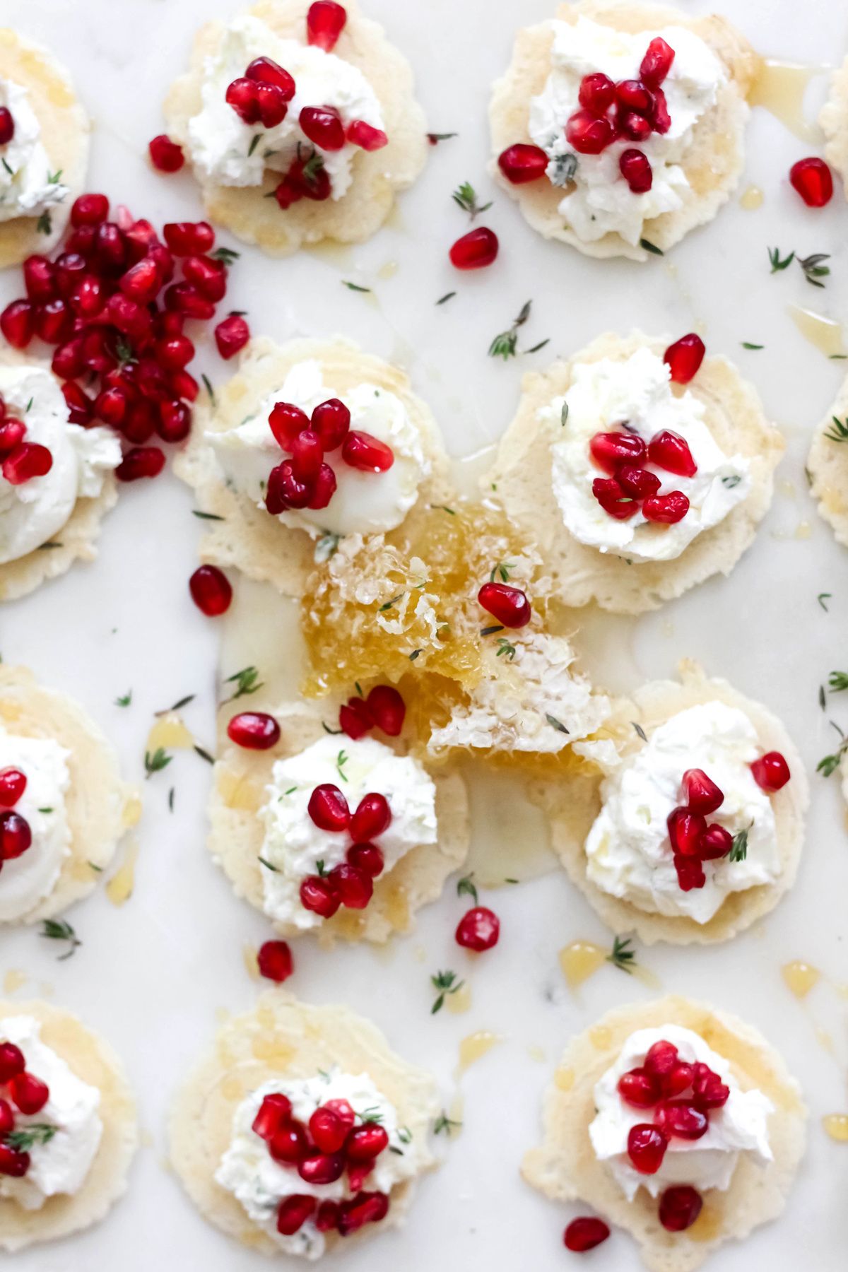 Simple, yet delicious Honey Thyme Whipped Goat Cheese Bites with Pomegranate are the perfect appetizer for the holidays!