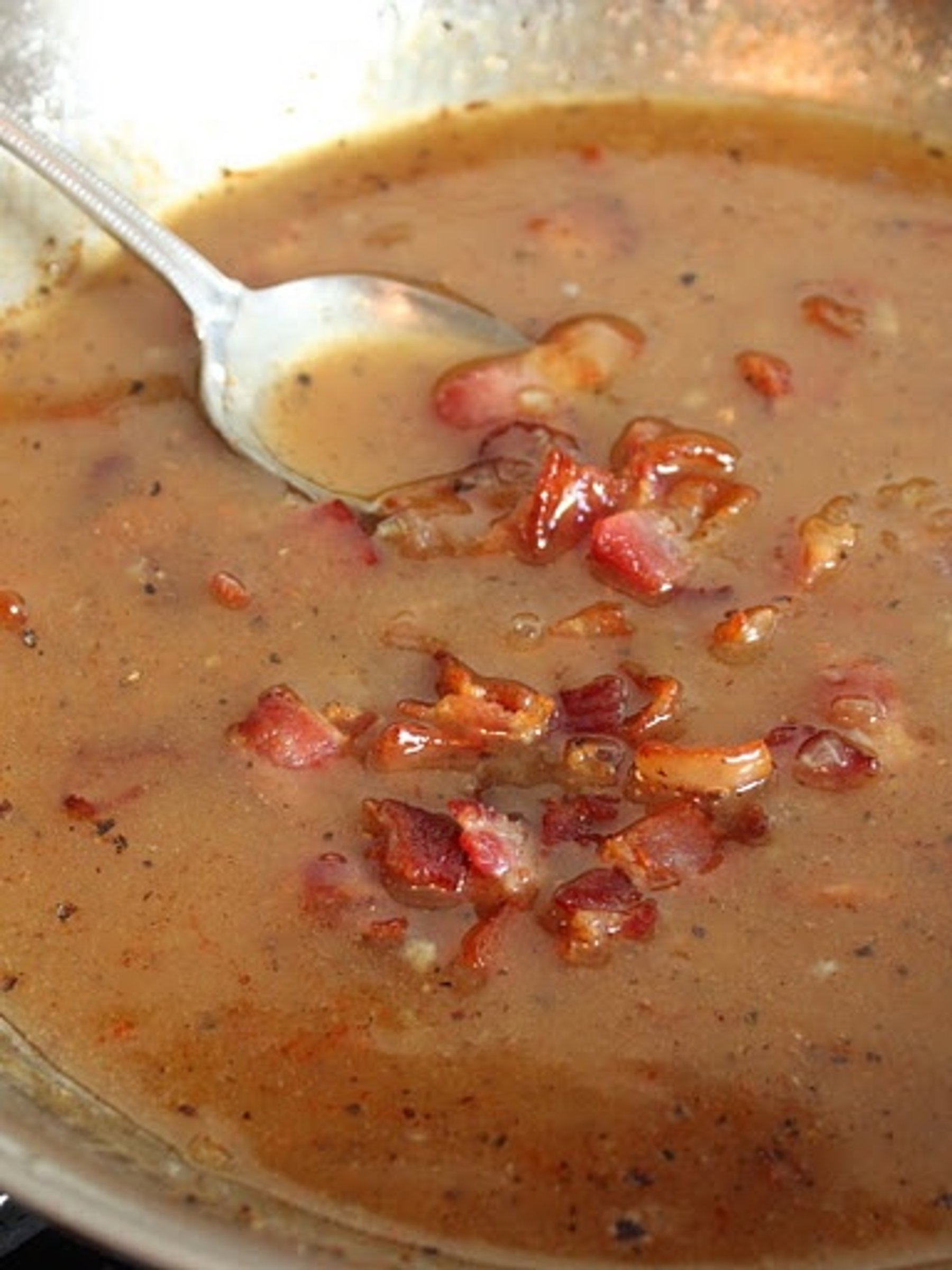 Turn heat down to low and whisk in 1/3 cup of reserved bacon drippings.