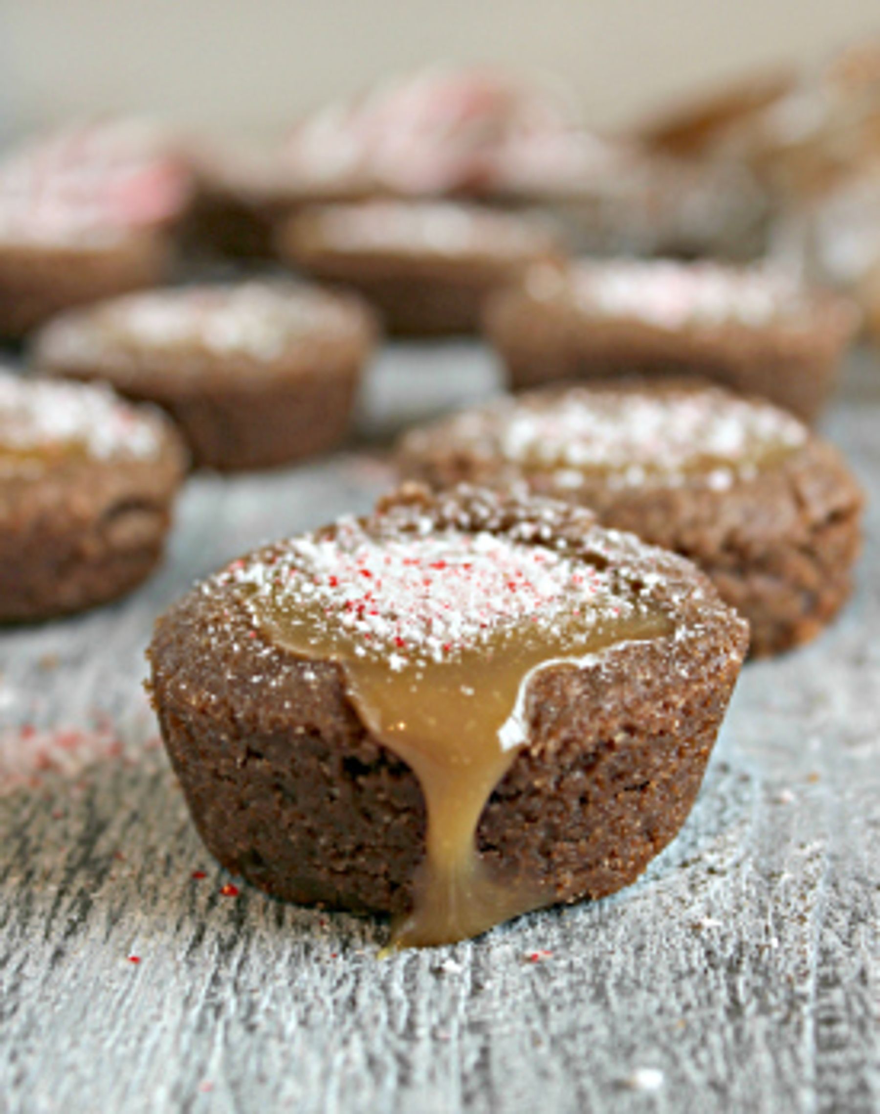 Salted caramel sprinkled with crushed peppermint and then poured inside a hot chocolate flavored cookie cup.