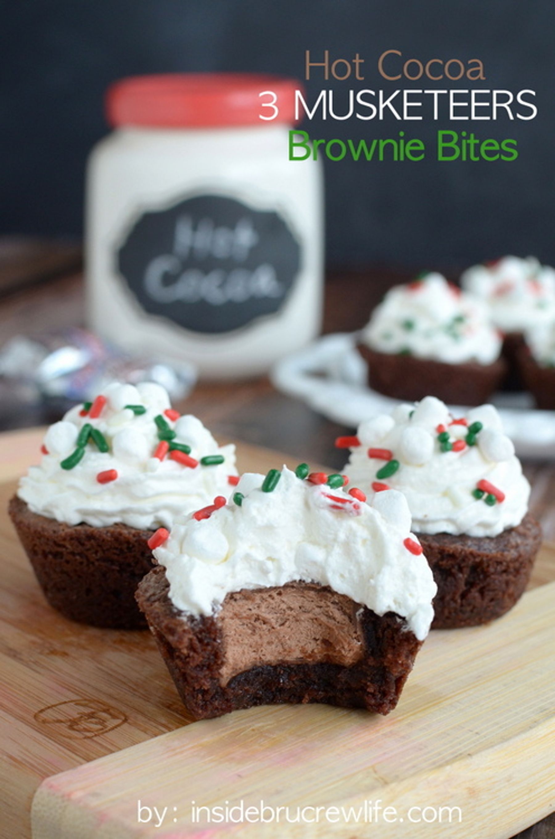Mini brownie cups filled with a 3 Musketeers candy bar