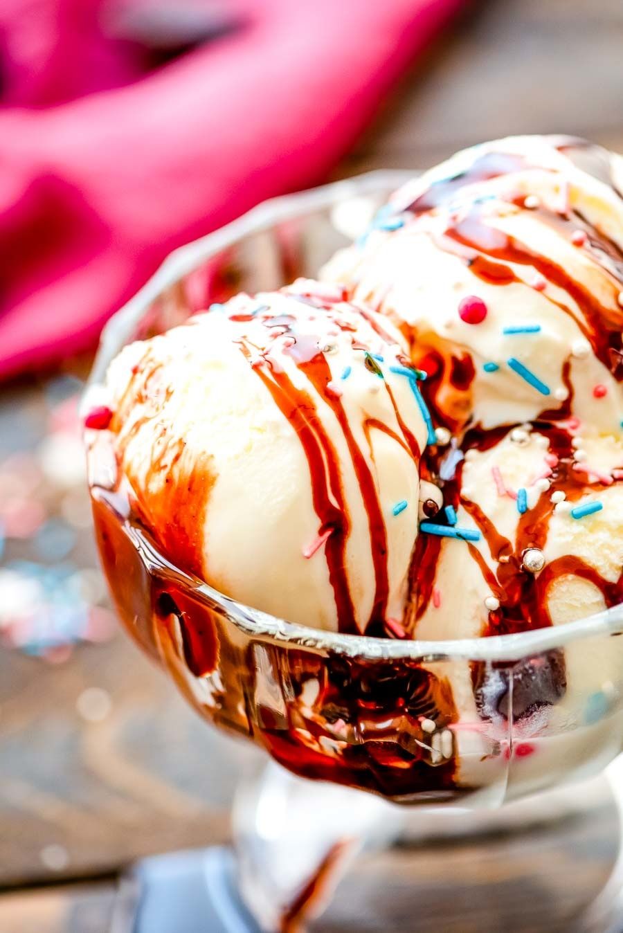 Hot Fudge Sauce is a delicious thick, smooth and rich chocolate sauce recipe with only five ingredients. It's the perfect topping for a big bowl of ice cream. Go all out and top your hot fudge sauce and ice cream with nuts, whipped cream and a maraschino cherry! It's perfect for a quick dessert over the holidays, when you have friends and family over or just because!
