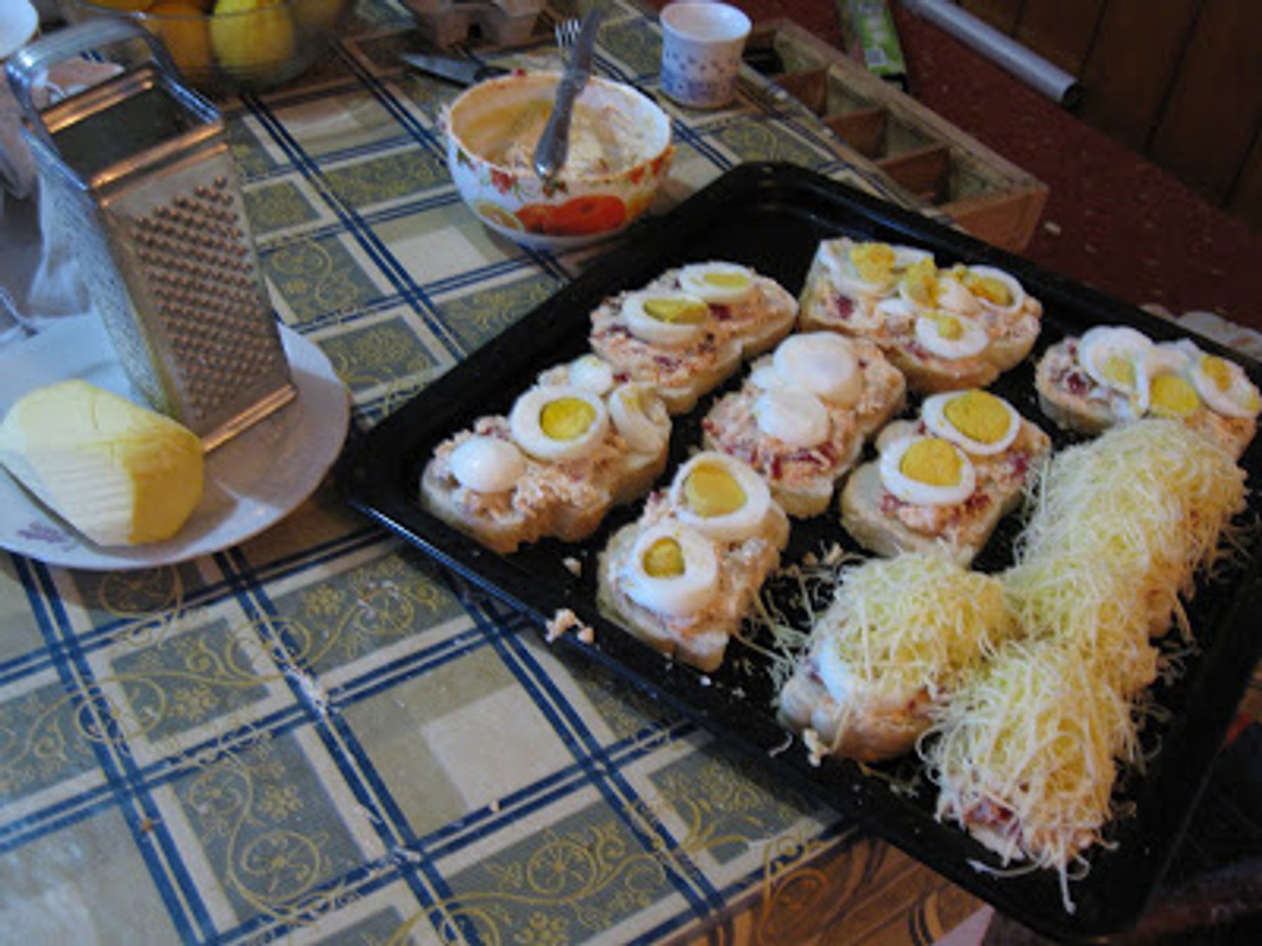 mix sour cream, cottage cheese, mustard. vinegar coated red pepper (cut into tiny pieces) , mexican sauce, salt leftover meat (cut into tiny pieces) chopped onion and swipe them on the slices of bread.