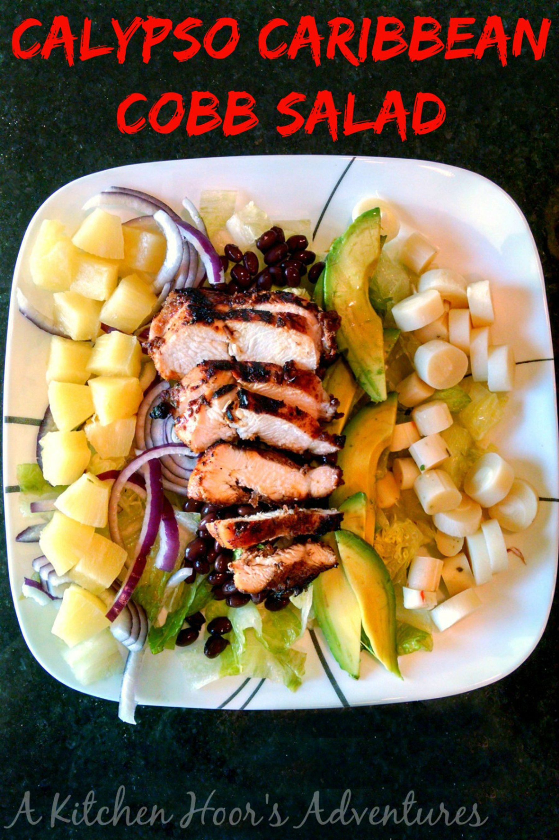A delicious Caribbean twist to the cobb salad, this #HotSummerEats Calypso Caribbean Cobb Salad has hearts of palm, pineapple, and jerk marinated chicken; transporting you to the islands.