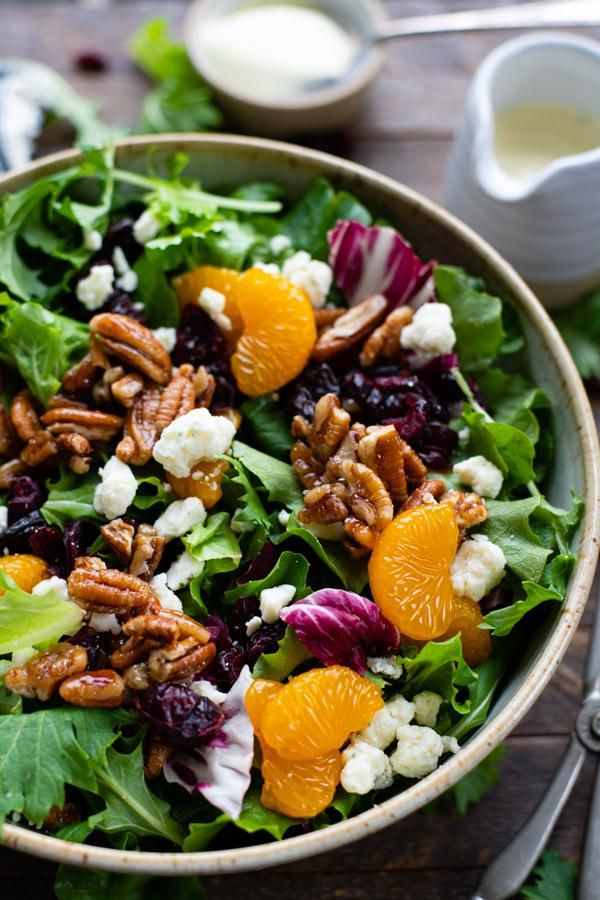 A restaurant-worthy House Salad that you can make at home, any night of the week! You'll love the sweet, tart, salty and savory combination of greens, candied pecans, dried cranberries, blue cheese and mandarin oranges in a creamy homemade dressing. Serve the salad as a side dish with grilled salmon, roasted chicken or pork chops. Alternatively, turn the salad into an entrée by topping it with meat or seafood and pairing it with a side of crusty baguette. It's fresh, delicious and full of flavor!