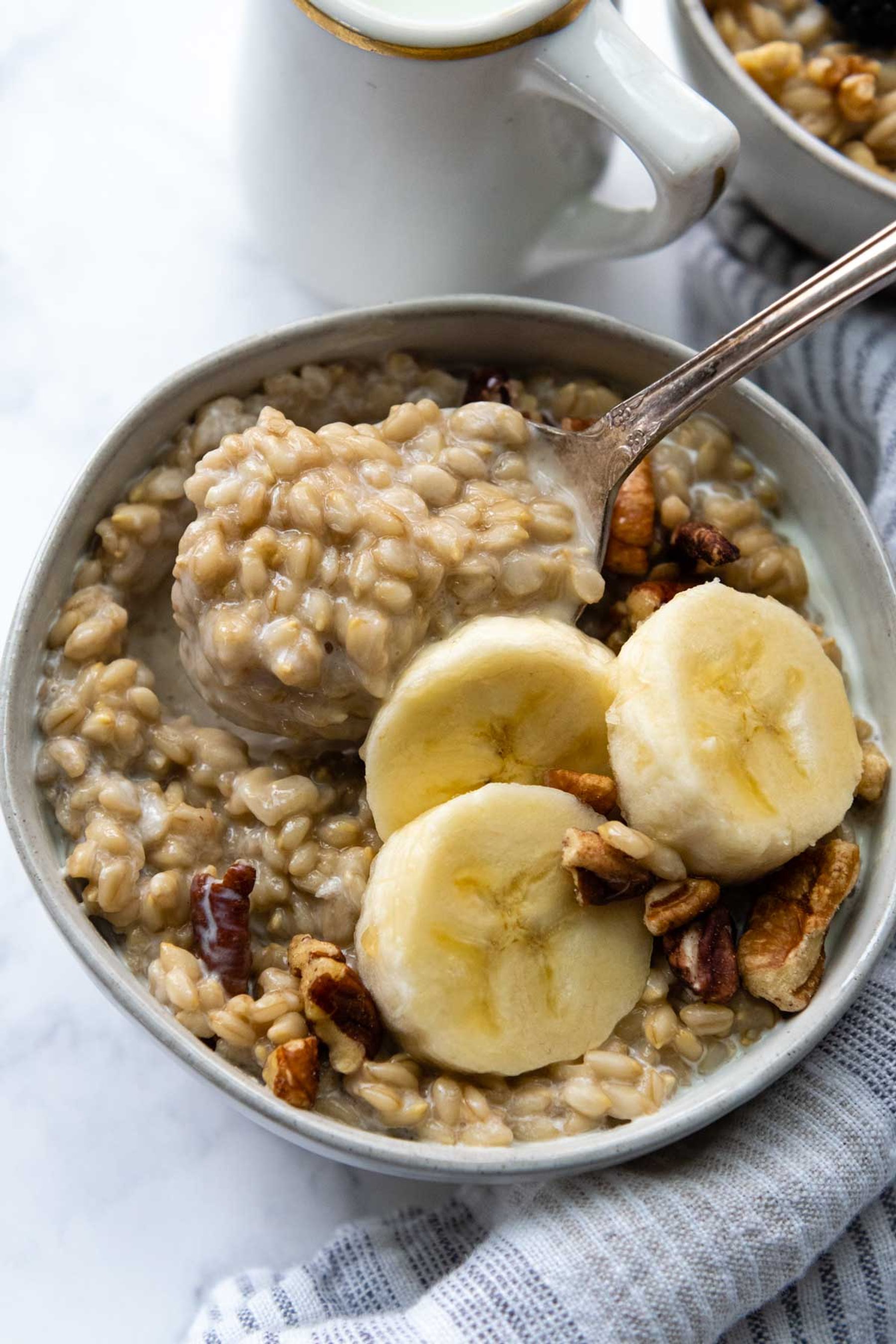 Learn how to cook oat groats with this creamy oat groats recipe! Find a variety of cooking methods, including stove top, Instant Pot, and slow cooker, along with a collection of tips and toppings!