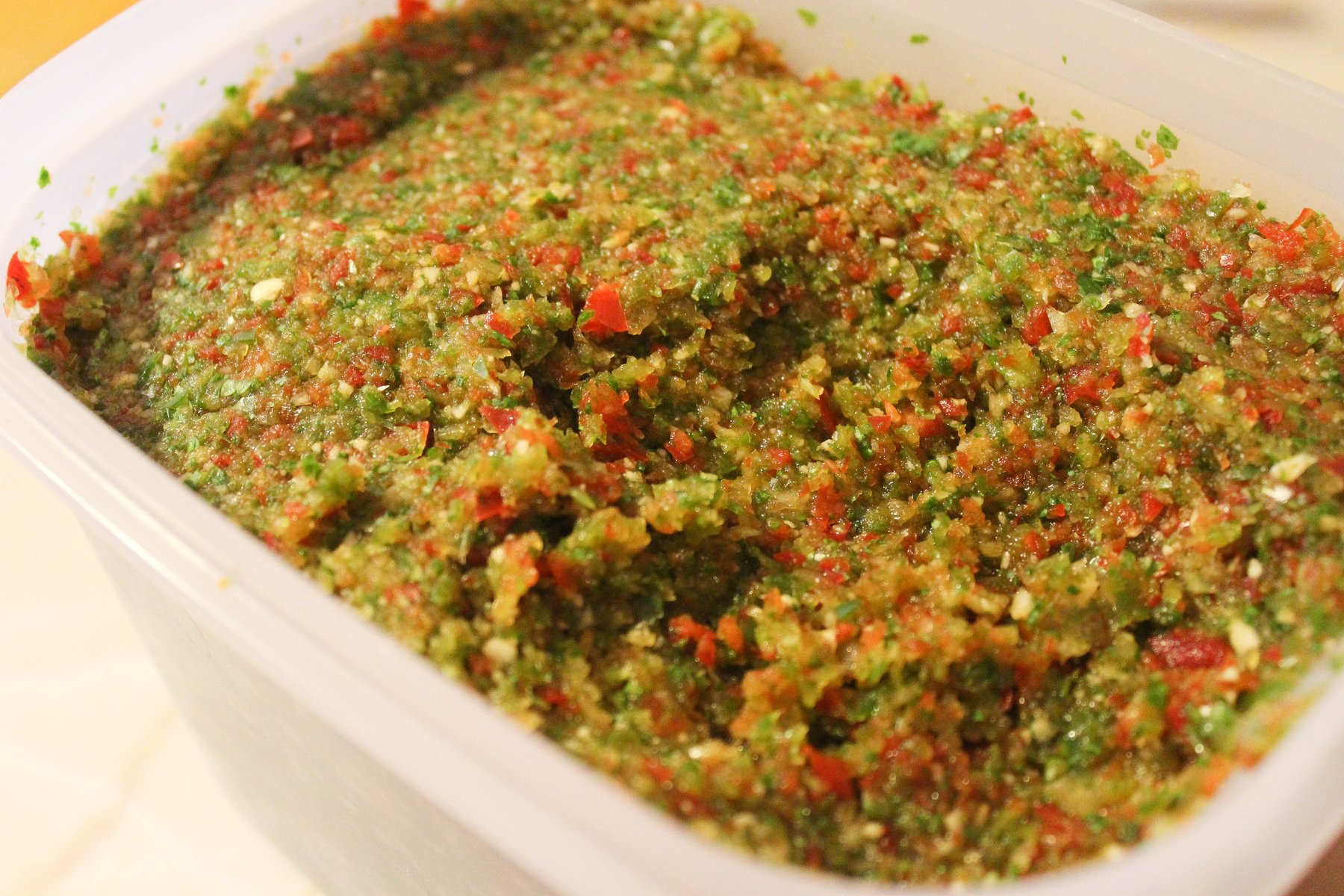 Pour sofrito mixture into a large air tight container