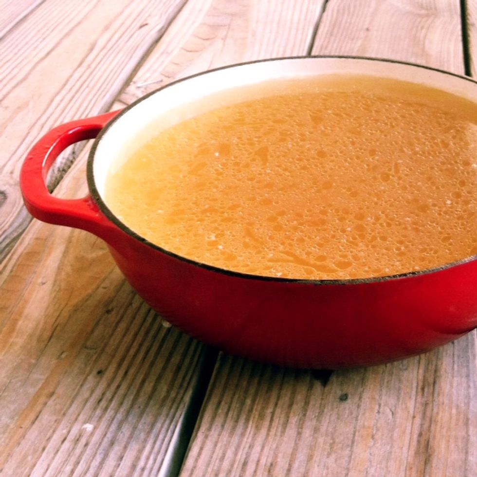 In a steel large pot or a dutch oven place boned rotisserie chicken and cover with cold water. The cold water draws out the juices. If there is still some meat left on the bones the stock does not need much...