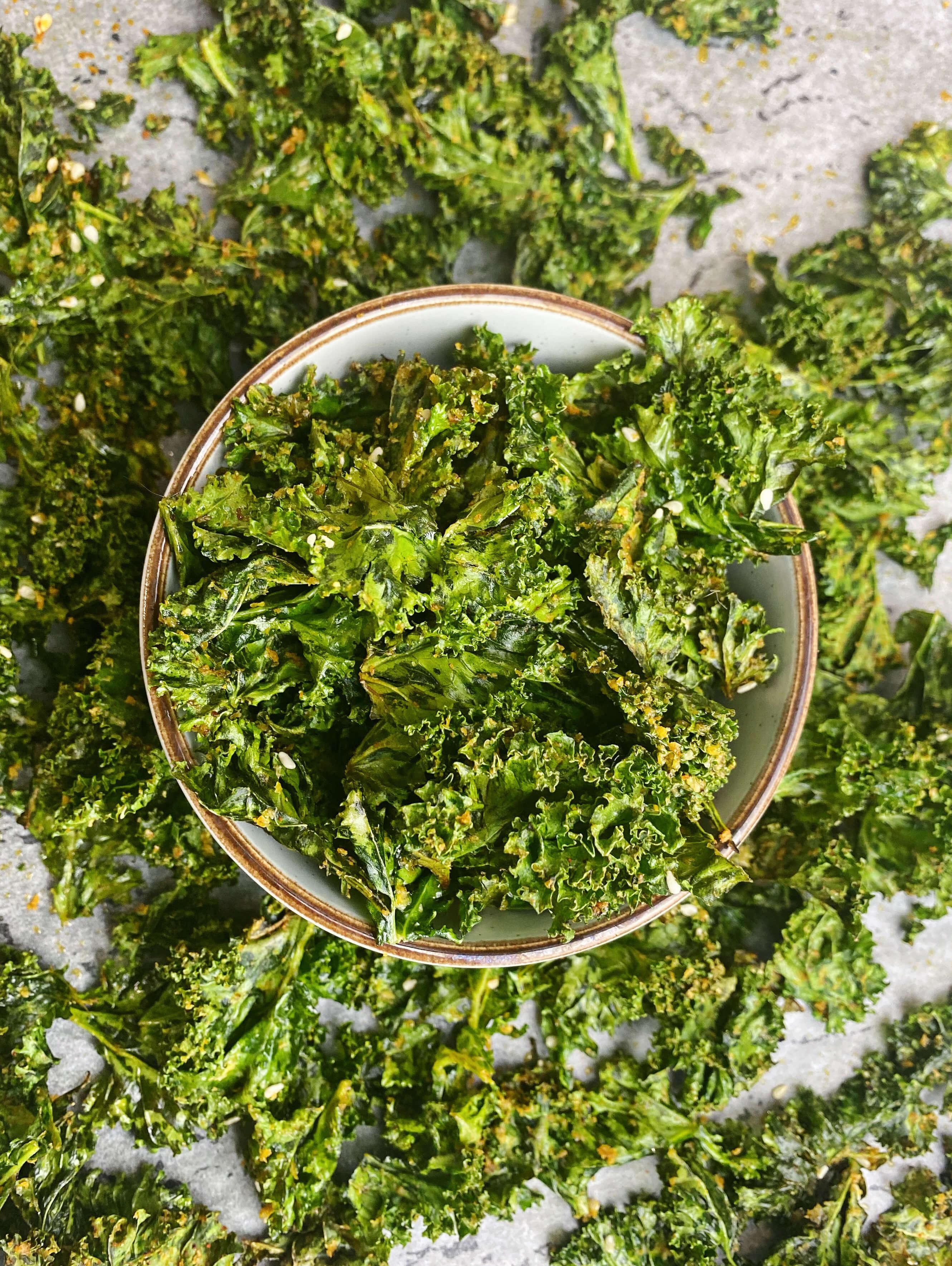 These crispy kale chips are a healthy vegan snack and packed with flavour. They're loaded with essential vitamins, minerals and antioxidants. Plus, they only take 20 minutes to prepare. You'll be shocked at just how tasty these kale chips are! Vegan, gluten free, dairy free, grain free, sugar free and soy free.