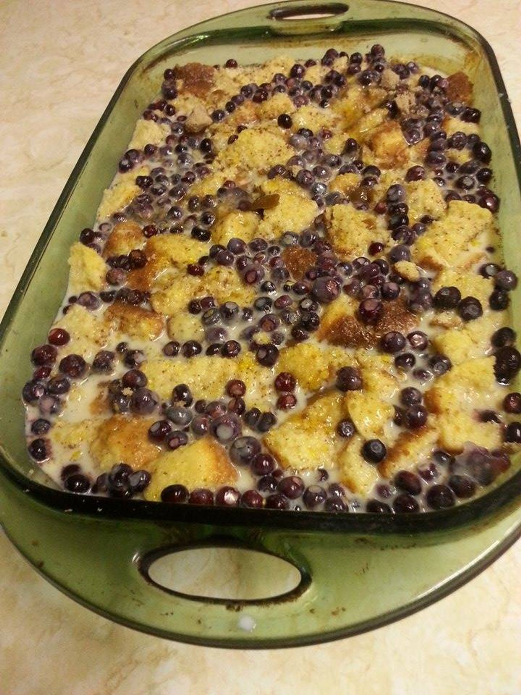 Use leftover corn bread or muffins to create this delicious breakfast or dessert! You can use blueberries in lieu of huckleberries!