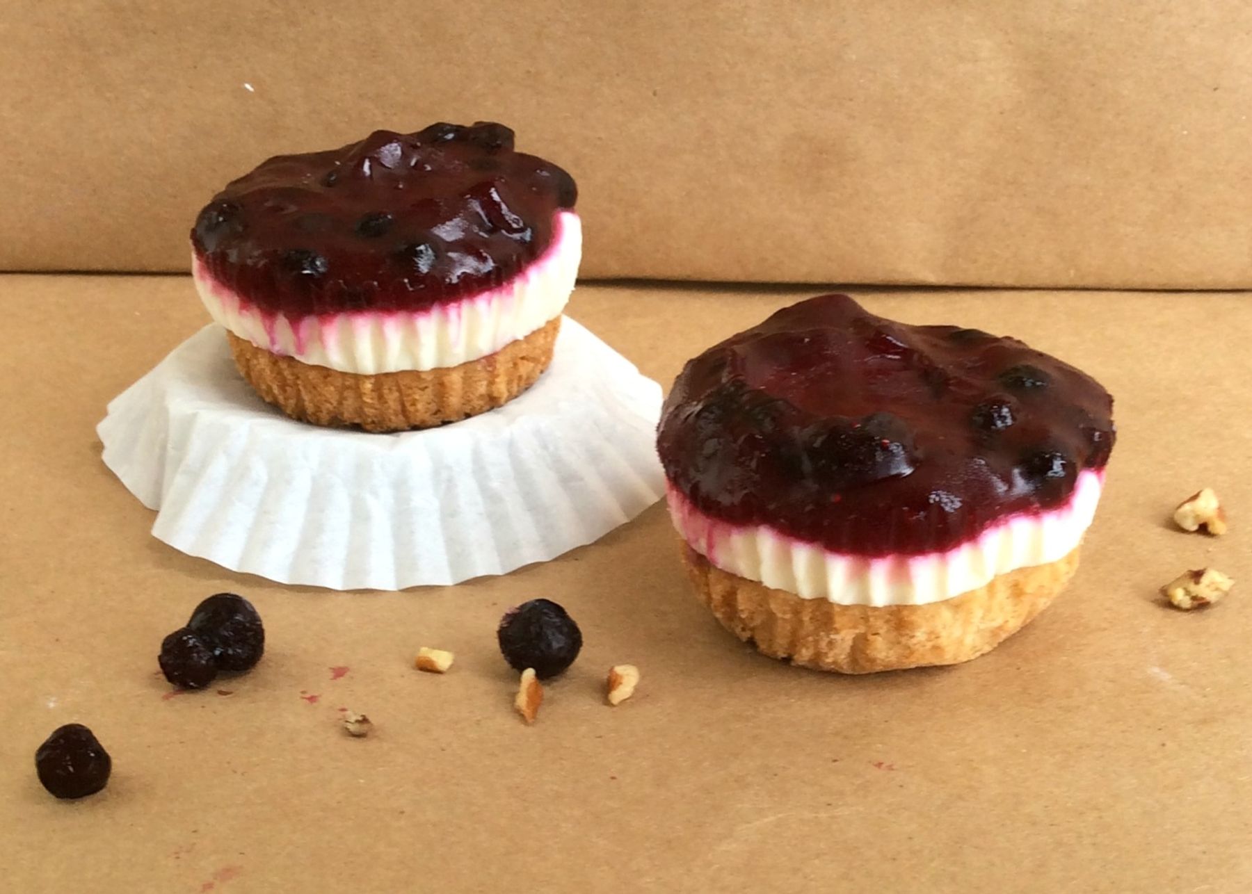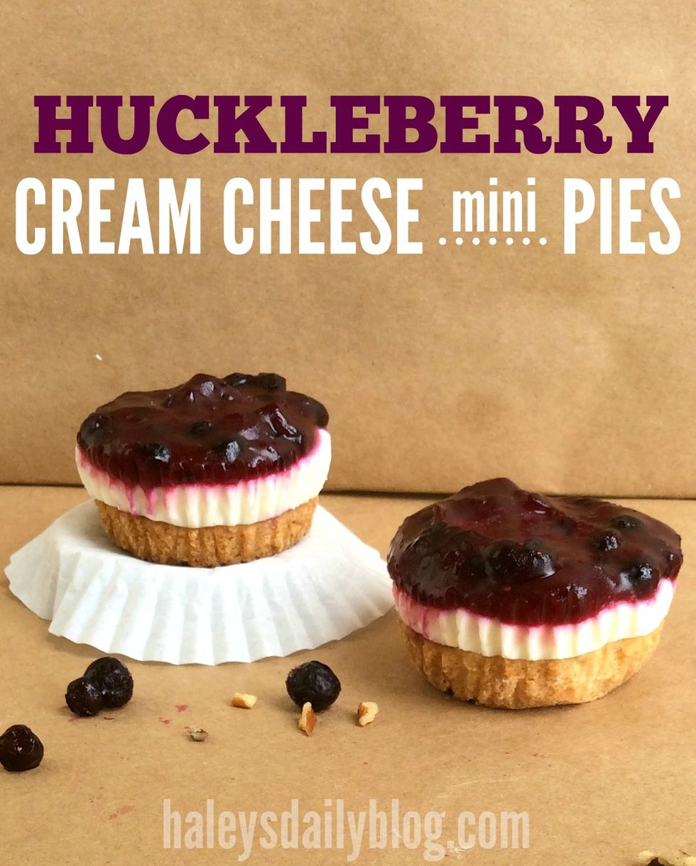 Pecan shortbread crust, sweetened cream cheese, topped with a delicious huckleberry sauce. These cute little pies are baked in muffin tins so they are just the perfect size. Try these with huckleberries like I did or substitute your favorite berry.