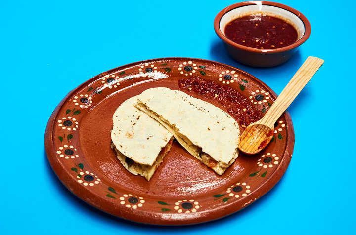 Recipe for quesadillas filled with huitlacoche, sautéed onions, and tomatoes prepared with corn tortillas.