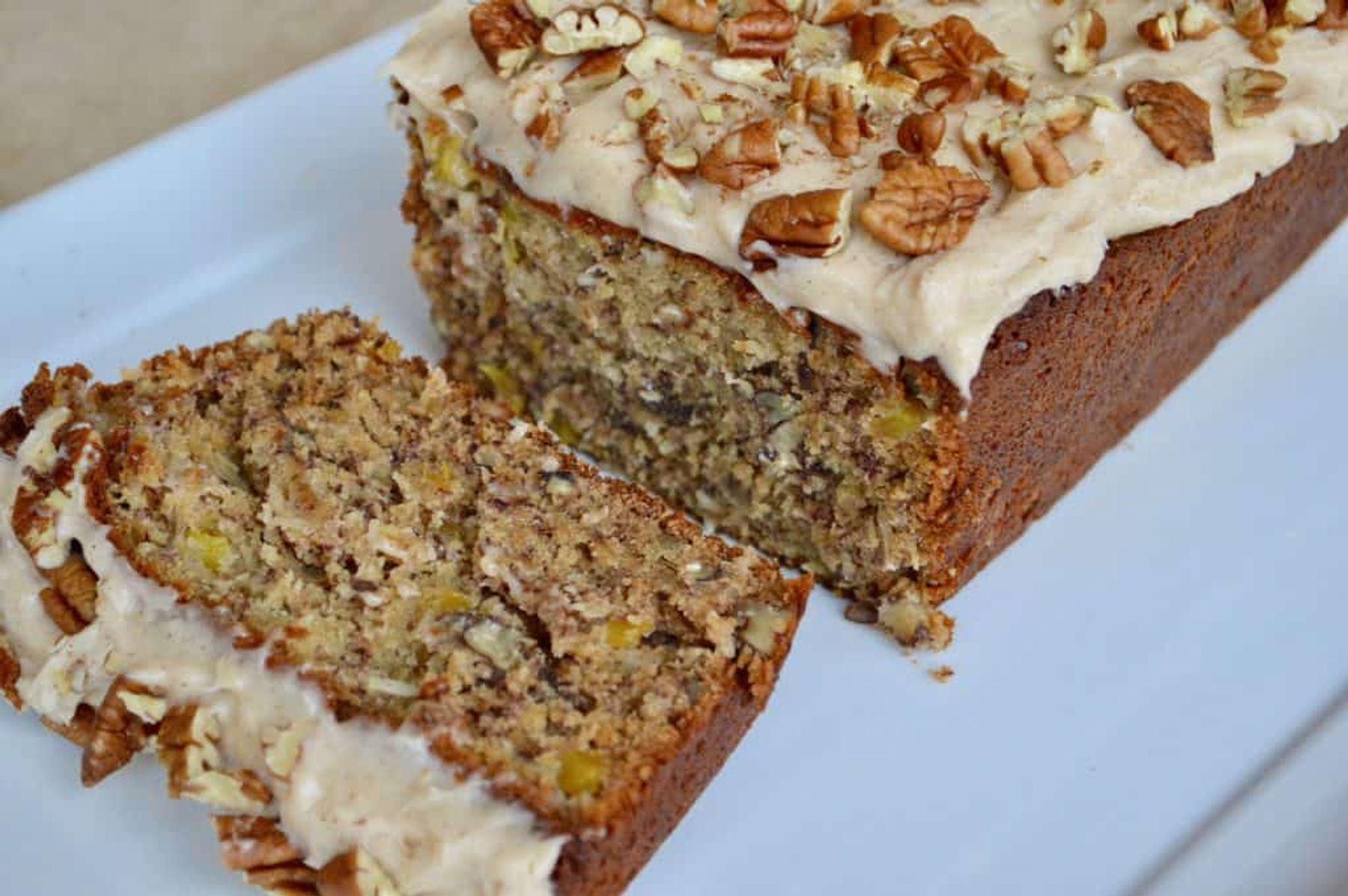 Delicious Hummingbird Bread is made with mashed bananas, crushed pineapple, shredded coconut, and chopped pecans, with cinnamon cream cheese frosting.