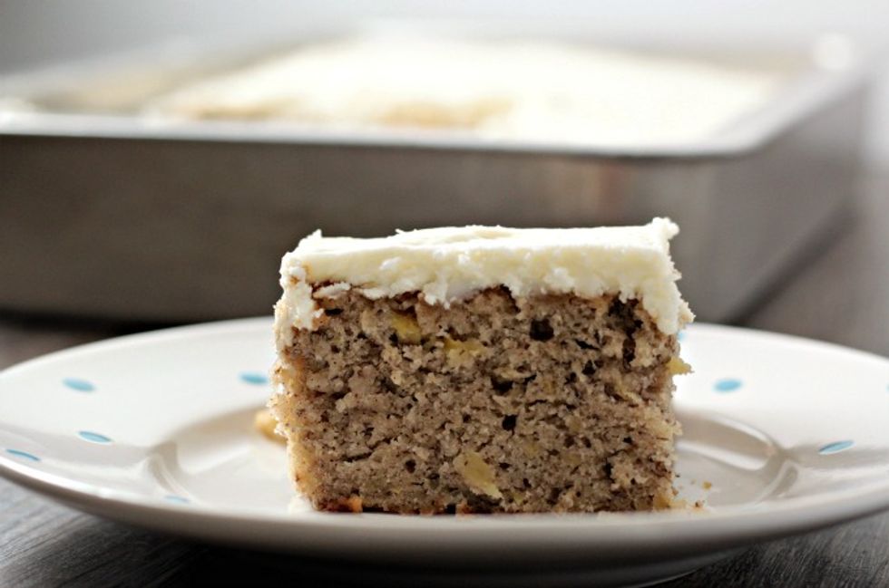 Hummingbird Cake (without nuts) has banana and pineapple, topped with traditional cream cheese frosting.