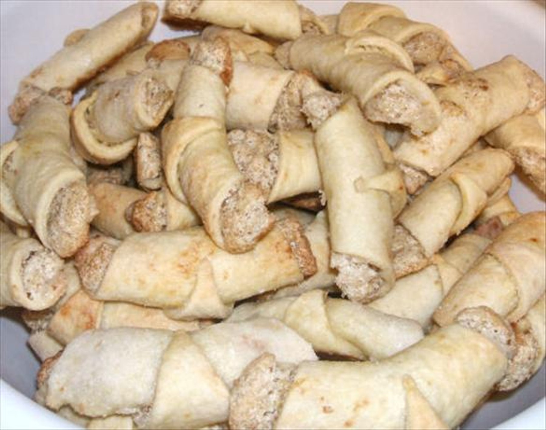 This is a wonderful cookie which has a walnut meringue like filling. It is a bit of a mess to make. You may need to make extra filling if you run out, or you could substitue jam as a filling. It is one of the must make recipes mom and I made each Chanukah. Roll your dough out in sugar, not flour.