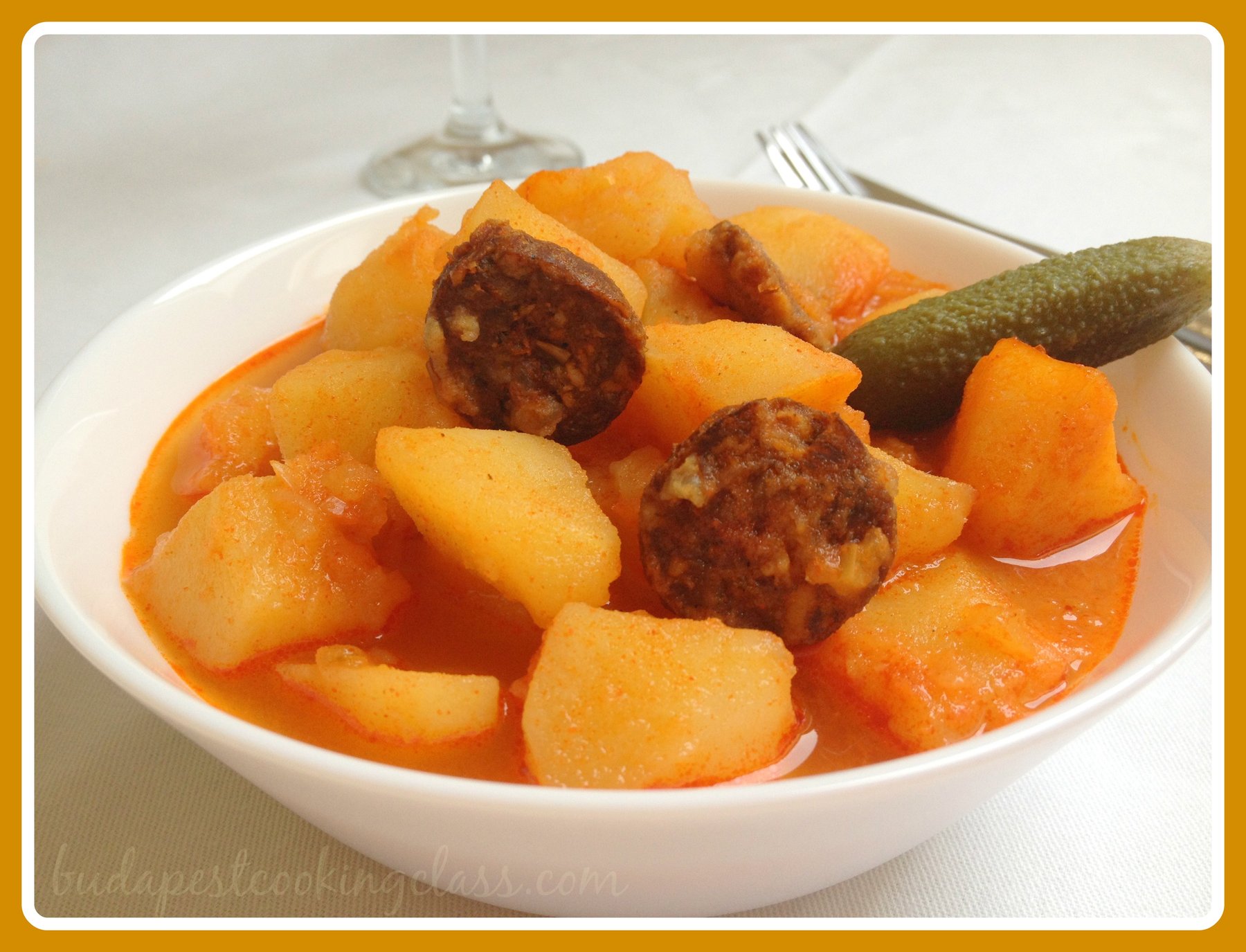 Hungarian potato paprika (Paprikás krumpli) is one of the most popular peasant dishes of the country, cheap, quick and delicious. You will often find in the rural areas and family cooking but rarely in restaurants. It can be a nice vegetarian dish, however, I almost always add some smoked paprika sausage.