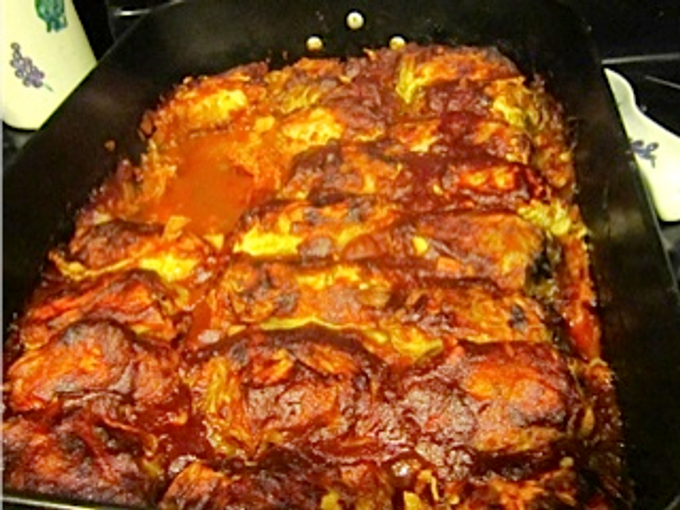 I n a large stock pot put water 3/4 way up with salt. . Take cabbage and remove cores on each. Set cores aside. Place both heads of cabbage in water and bring up to simmer. When leaves become loose, remove heads from water and set aside. Carefully remove leaves being careful not to rip. I removed about 10-12 on each head. Place those aside. With remaining smaller leaves. chop up as well as your cores and place into huge turkey roasting pan. Put chopped onions on top. Add sauerkraut. Not drained.Mix by hand to make it evenly mixed.Take meat and add 1 of the chopped onions, add rice and your oil. mix well. Take one leaf and cut triangle wedge out of bottom of leaf to aid in rolling. place about 1 big tablespoon of meat mix on cabbage leaf near bottom. fold bottom up slightly. fold in right then left sides to cover meat. roll up. place seam side down in roaster pan. repeat with remaining leaves. In a big bowl. Mix your tomato sauce and tomato pastes. add brown sugar. This time I added a lot of sugar and it was too sweet for my taste. add 8 T of sugar or more( I ended up using almost 3 times more so my husband would like it) Add your garlic,cinnamon and water.Check the taste of it. mix well. pour over your rolls. Sprinkle generously with paprika( I liked the smoked paprika) Cover and bake 350. Check after about 1 hour. baste rolls as needed to keep from drying outWill need to baste a couple times.. Bake 2- 2 1/2 hours. I made 22 rolls this time