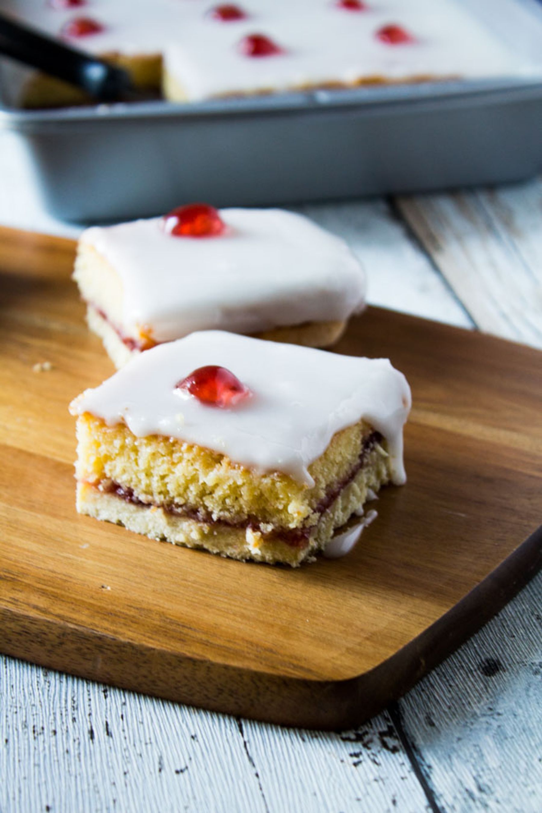 Take the classic Bakewell tart recipe and make it into a tray bake! A golden layer of shortcrust pastry filled with an almond cake, strawberry jam, and topped with icing and glacé cherries!