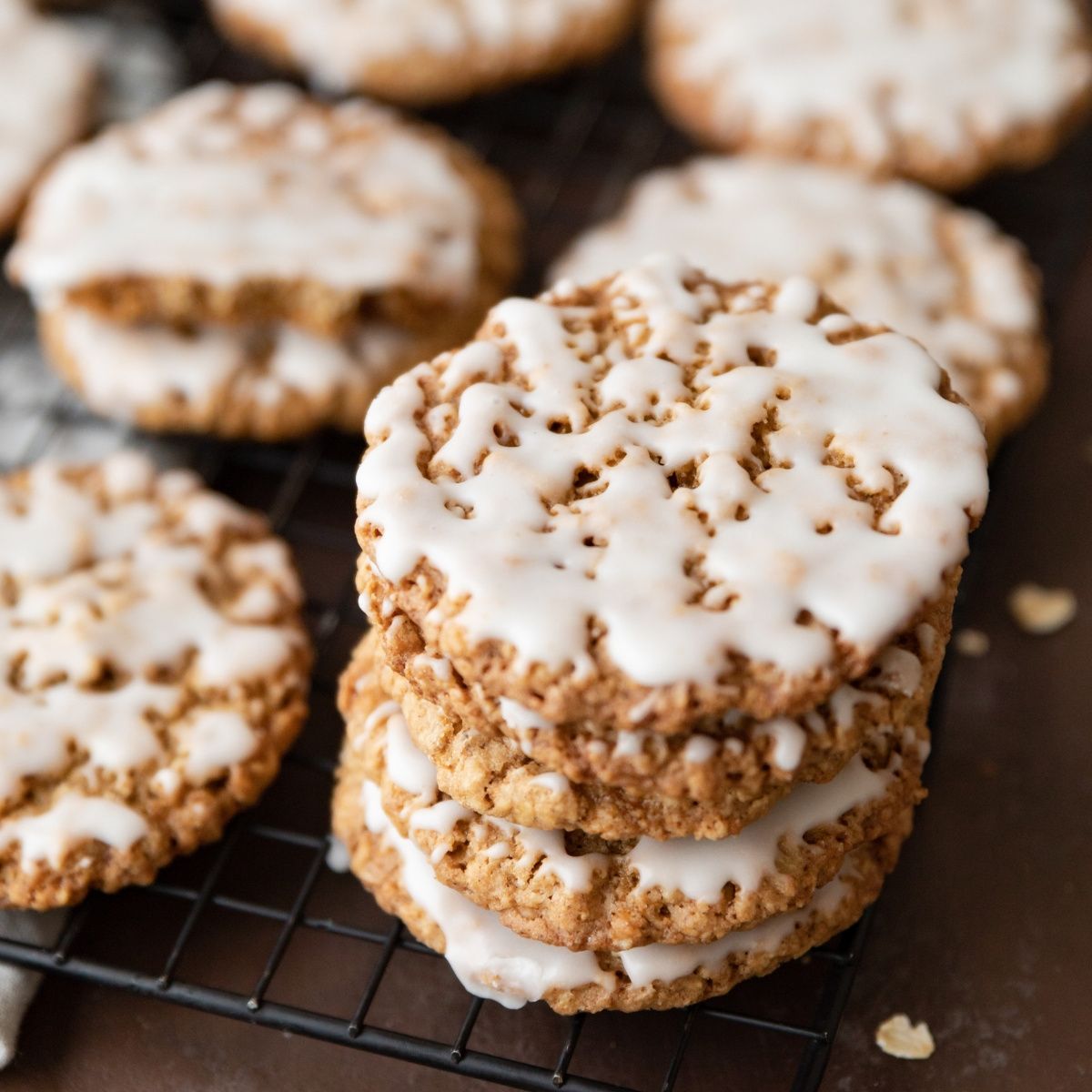 Iced oatmeal cookies are an old-fashioned recipe with soft centers and crisp edges. Each cookie is infused with molasses, cinnamon, and nutmeg then topped with a sweet glaze.