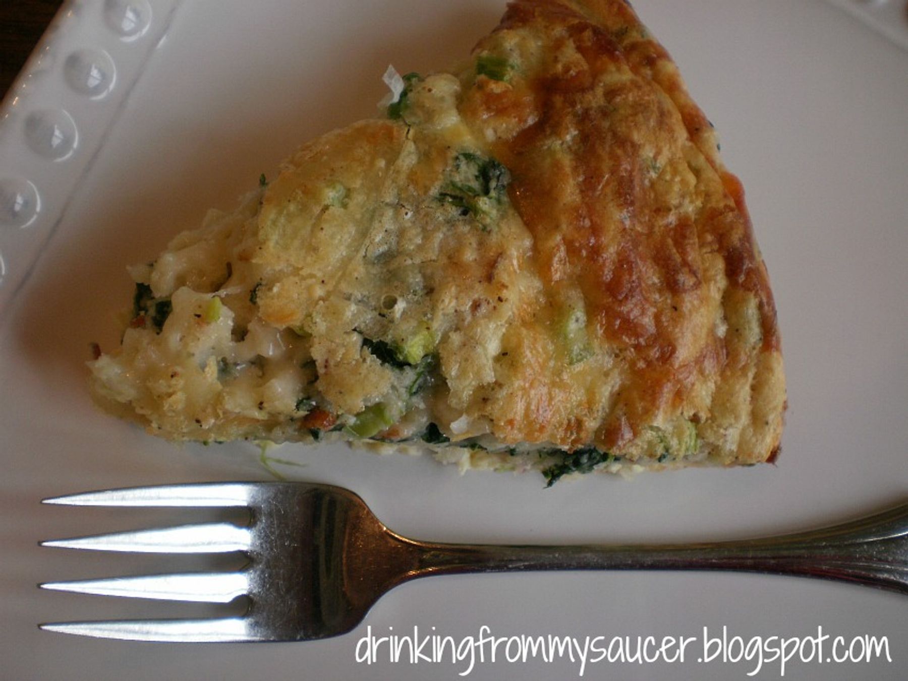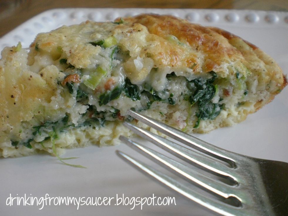 Heat oven to 375F. Grease pie plate. Mix spinach, cheese, onion, and bacon in plate.