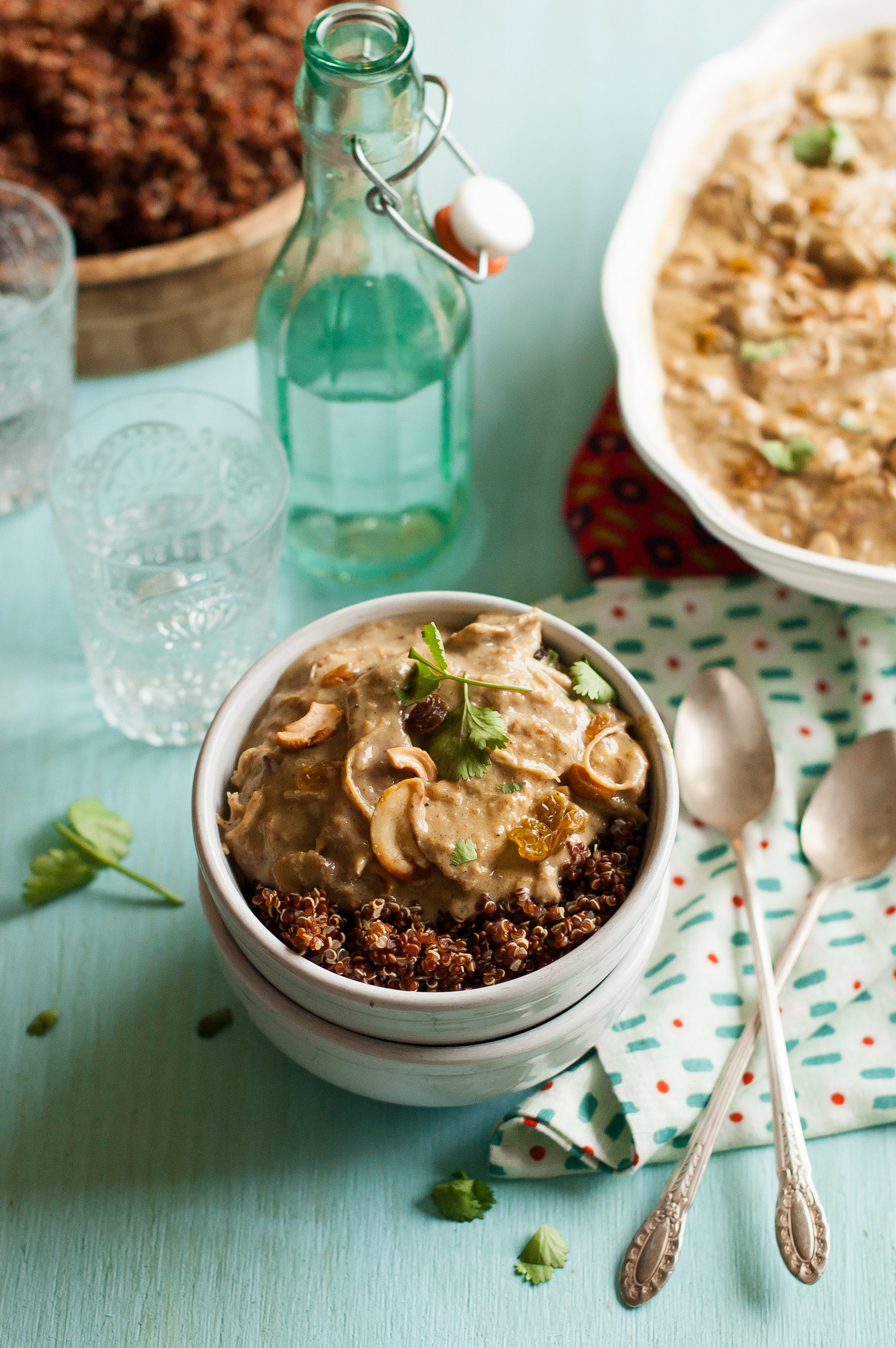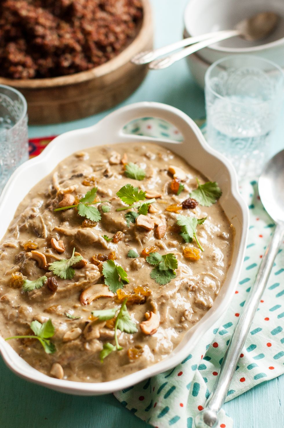An Indian chicken dish with cashews, coconut and raisins.