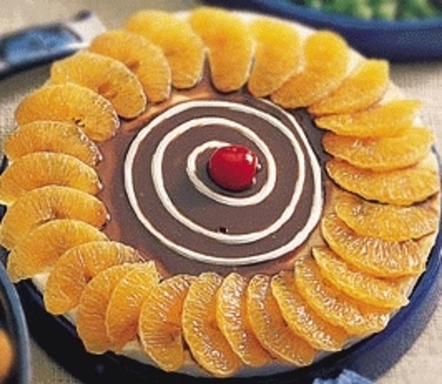 Remove the cake from the tin, spread the melted chocolate, pipe the balance sweetened cream in the centre and decorate with orange segments and cherries.