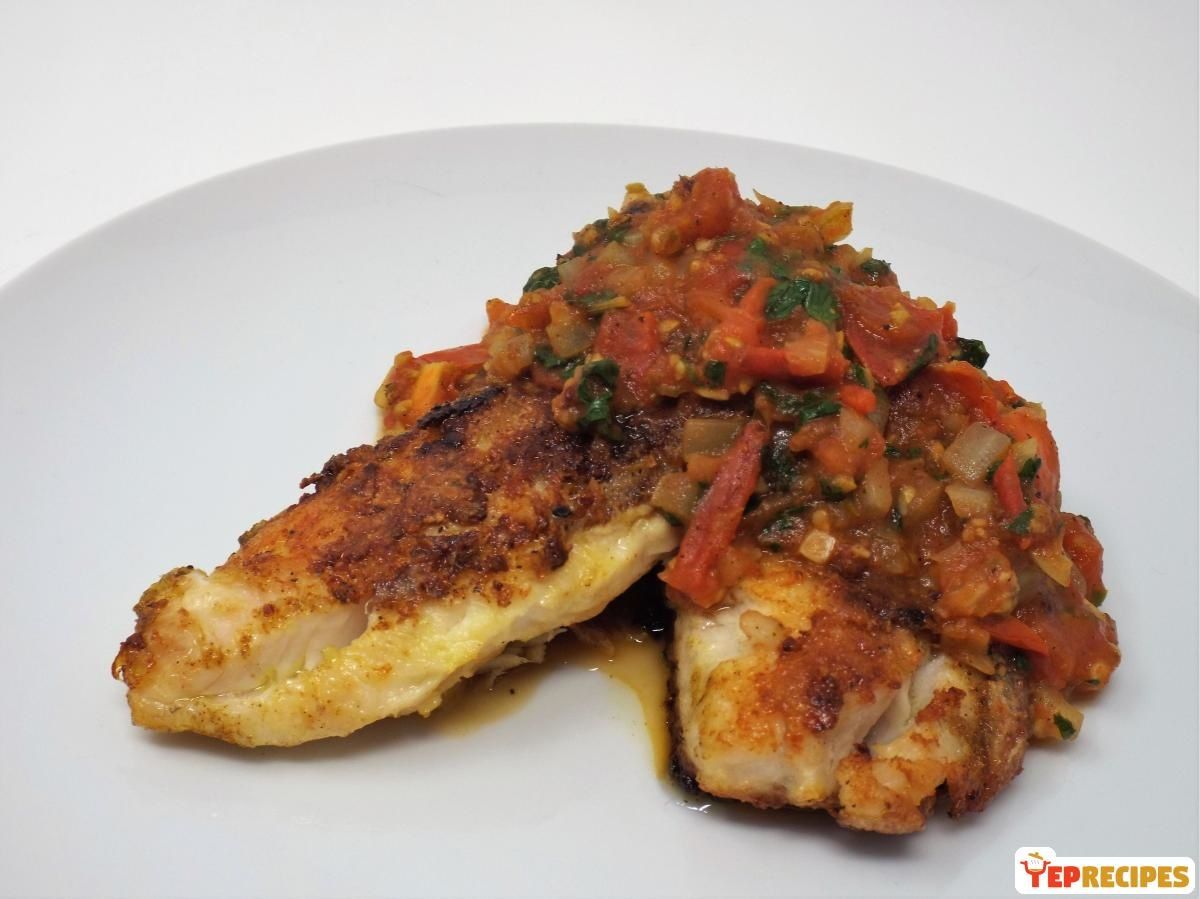 Tilapia marinated in a yogurt and chile-garlic paste then fried and served with a fresh tomato chutney.