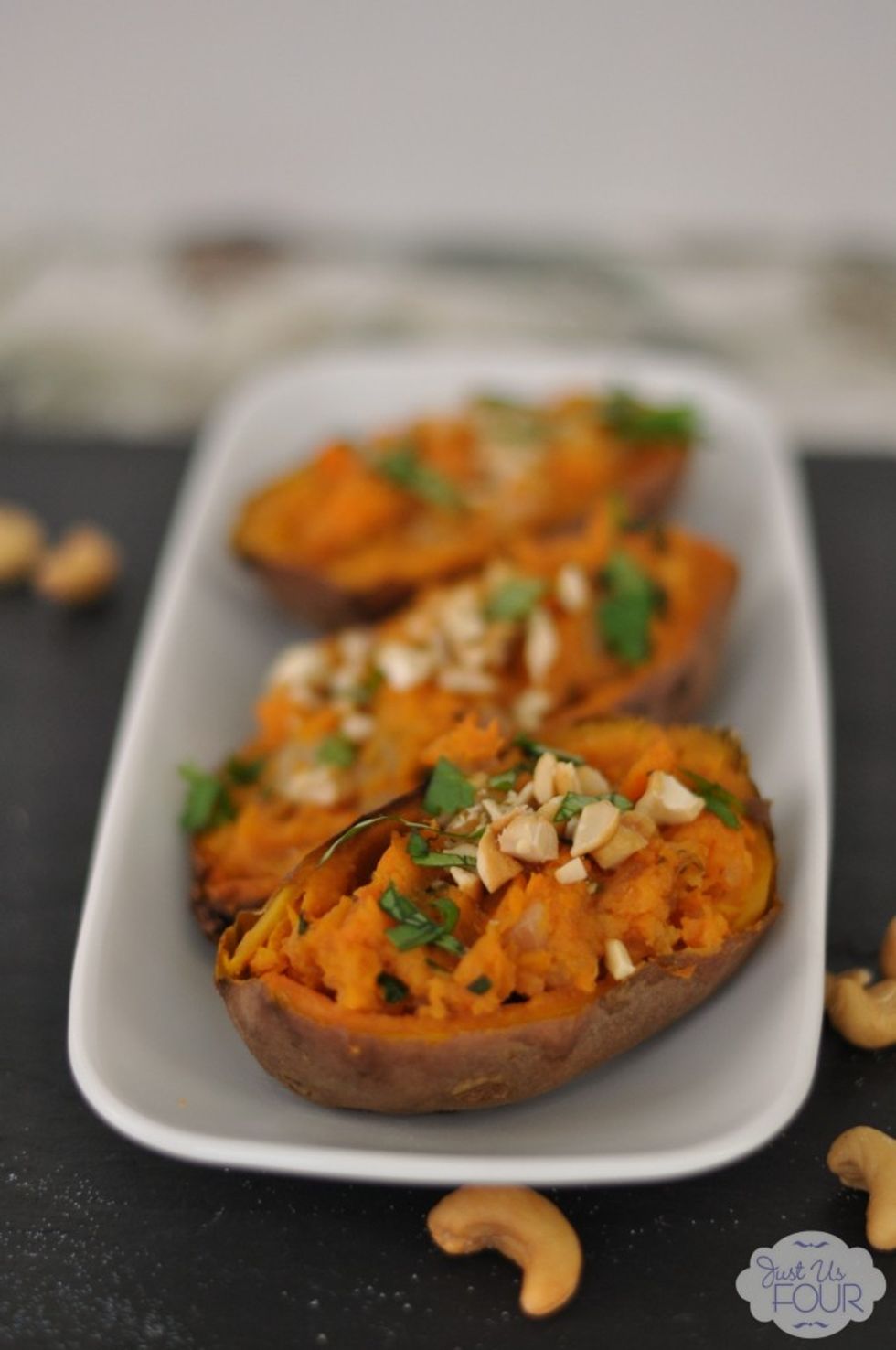 Delicious sweet potatoes stuffed with blend of Indian spices and topped with crunchy cashews.