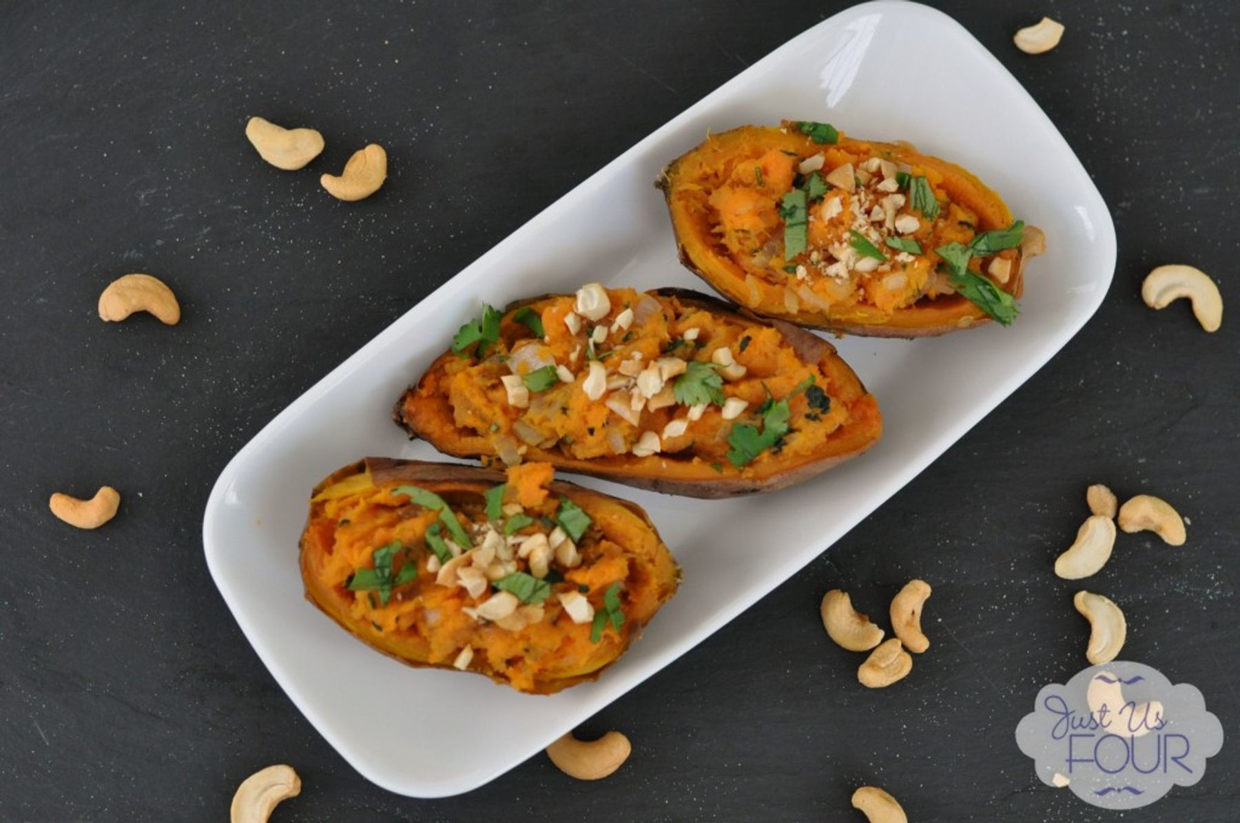 Delicious sweet potatoes stuffed with blend of Indian spices and topped with crunchy cashews.