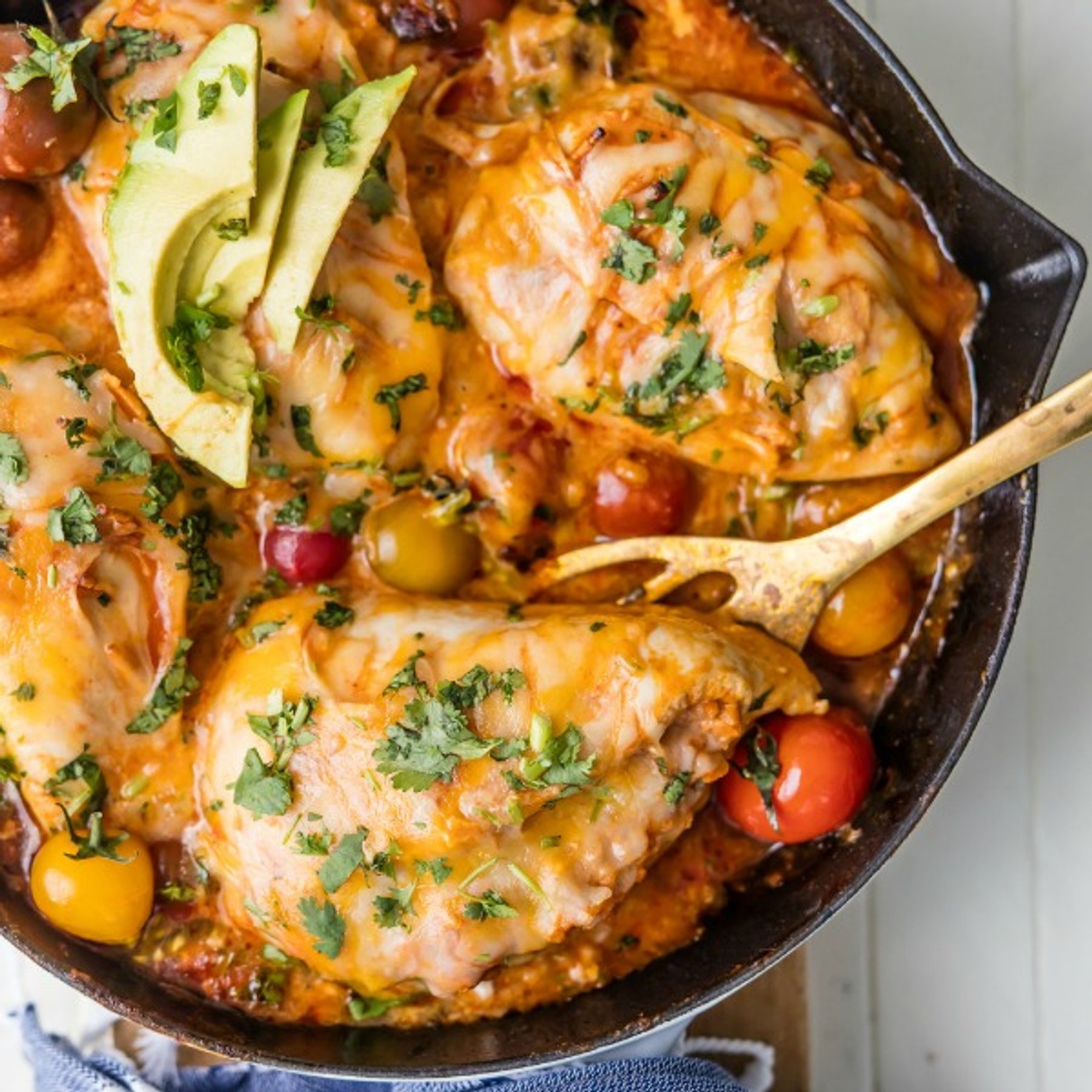 We LOVE Inside Out Chicken Enchiladas, aka Enchilada Stuffed Chicken Skillet! This one pot meal is cheesy, easy, and all kinds of delicious.