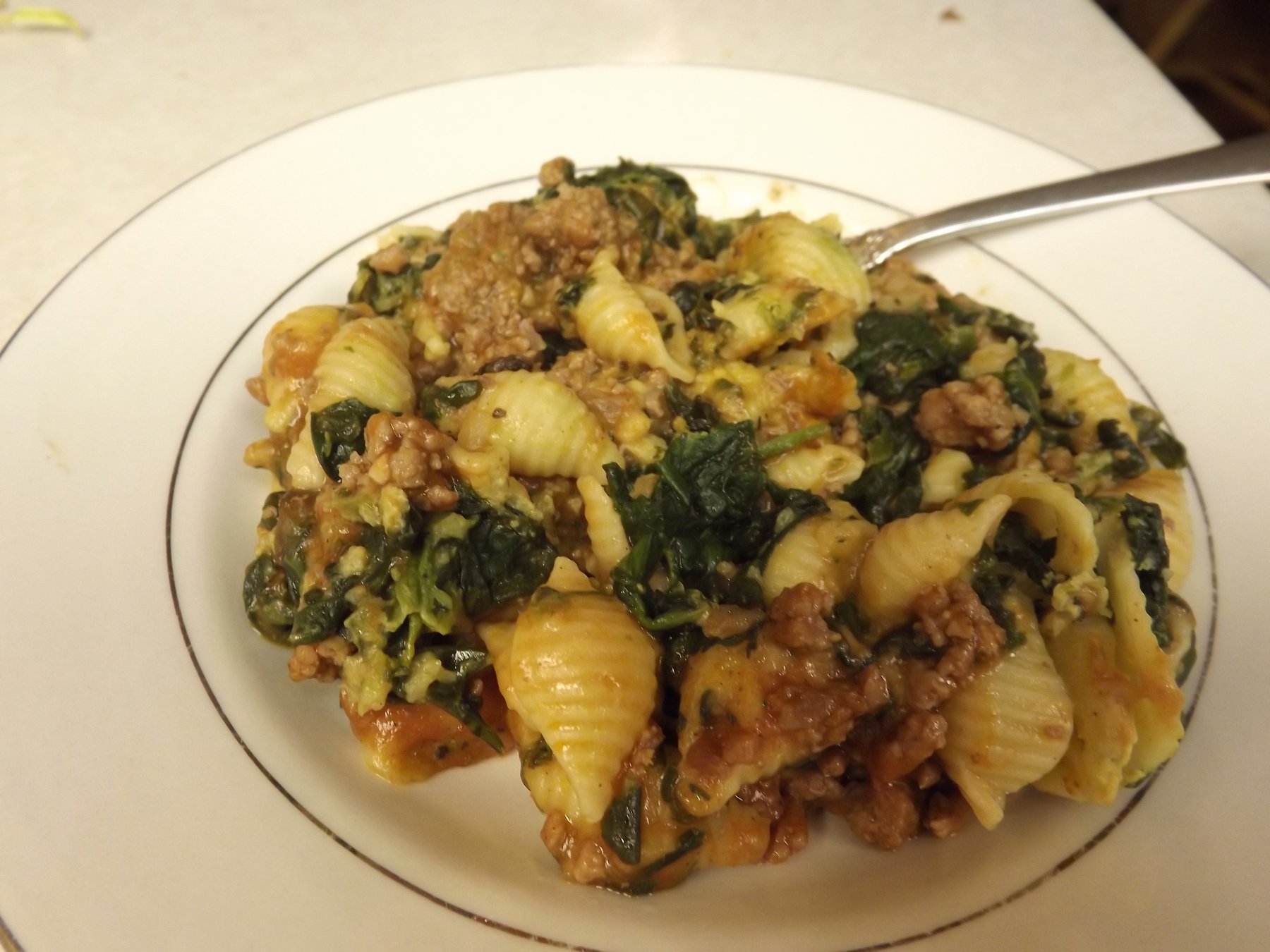 Brown beef, onion and garlic salt.. Drain then add spaghetti sauce. Cook spinach, following package directions. Drain. Combine spinach, shells, cheeses, bread crumbs, eggs and oil. Spread in a 9 x 13 inch baking dish. Top with sauce. Bake at 350 degrees for 30 minutes. Let stand 10 minutes before serving.