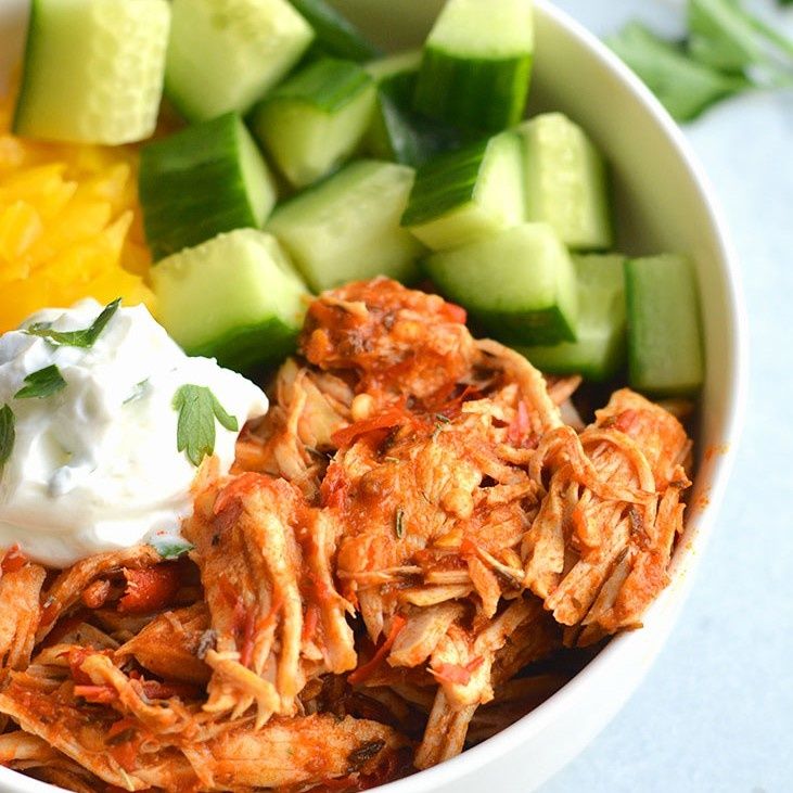Instant Pot Harissa Shredded Chicken Bowls! This simple, healthy shredded chicken is cooked in under 30 minutes in an Instant Pot with Harissa for a spicy kick! Paired with sliced cucumber, bell pepper and Greek yogurt for a complete meal! Low Calorie + Gluten Free