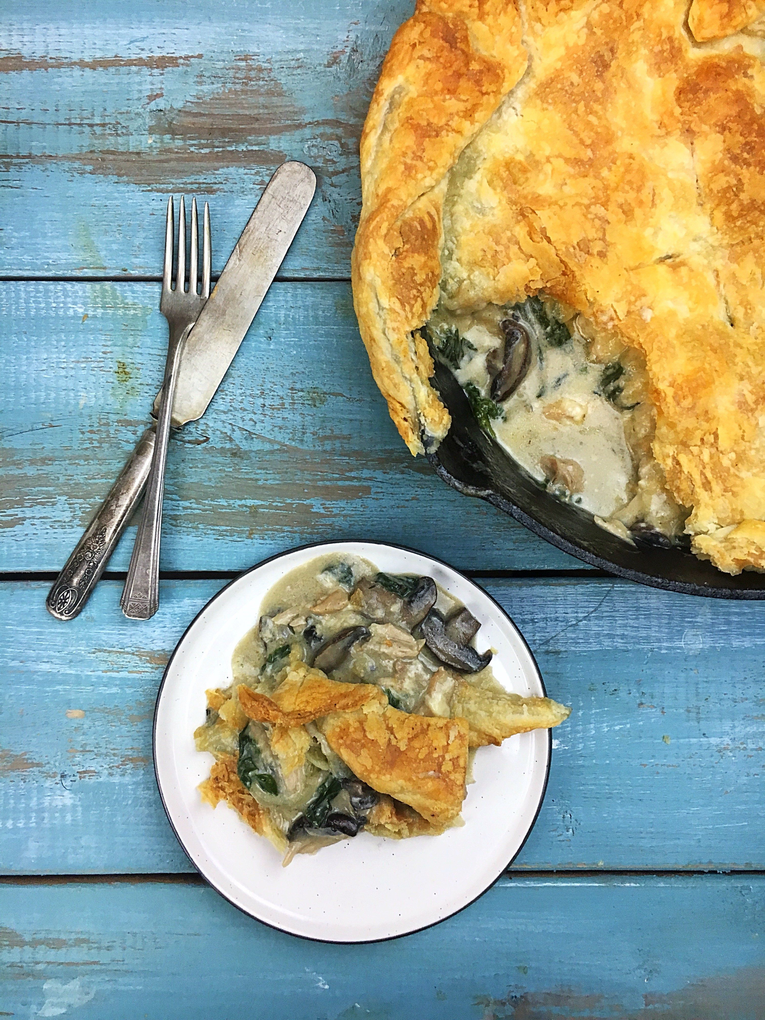Using only one Iron Cast skillet, crispy puff pastry, spinach, mushroom and chicken, this hearty dinner recipe is no fuss to make.