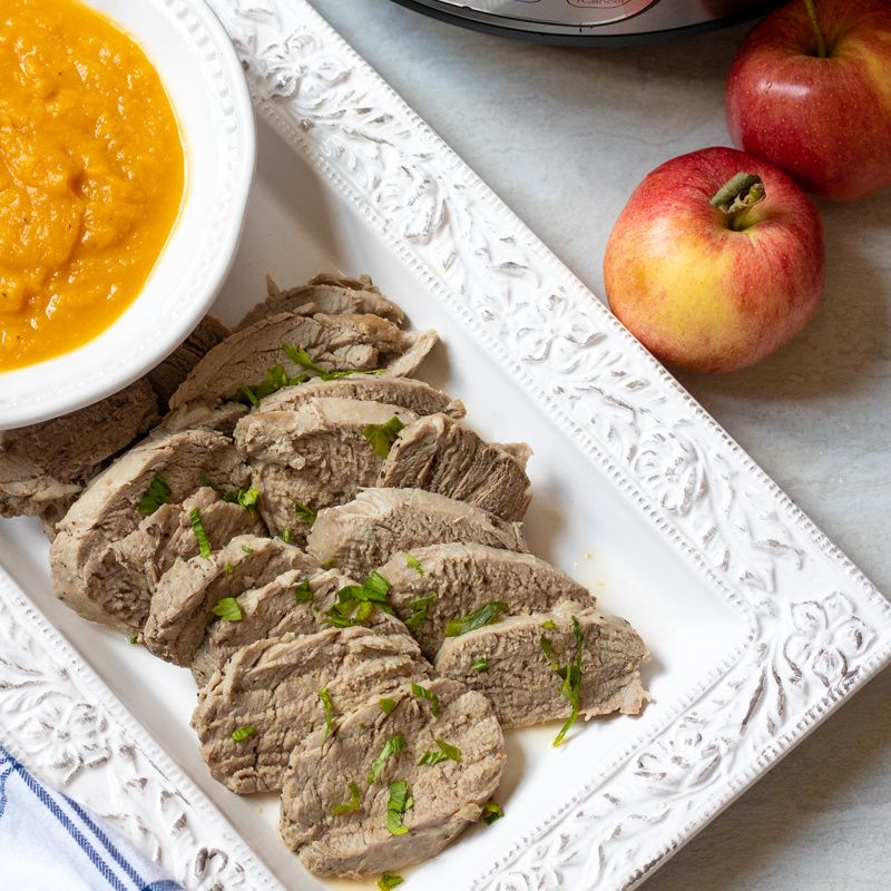 Perfectly cooked pork tenderloin is paired with sweet potatoes and apples for a wonderful easy meal all made in the pressure cooker in less than 30 minutes.