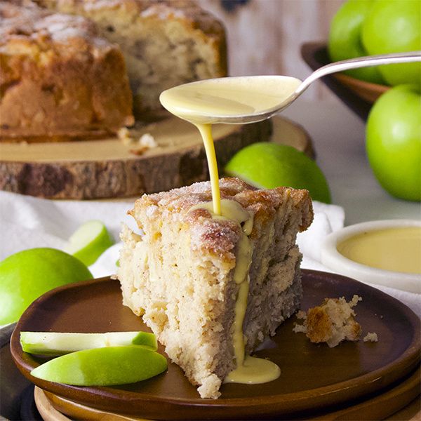 Tart, crisp apples suspended in tender vanilla spice cake with a crunchy sugar topping and creamy vanilla custard sauce.