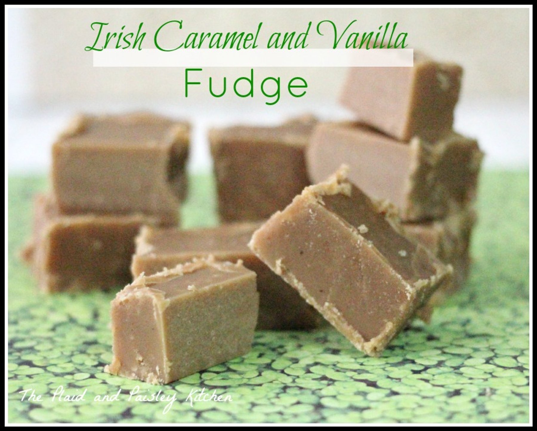 So what makes this fudge Irish you ask? Well other than the bed of clovers that it is pictured on, fudge is most often served at the end of every supper {we call it dinner} as petit four. The two most common flavors for fudge in Ireland? Well as you would guess coffee and then this Vanilla. They would probably not call this fudge caramel like I have and just called it Vanilla. This really does have a rich dark caramel color and that caramel flavor is very prominent. You don’t need a very large