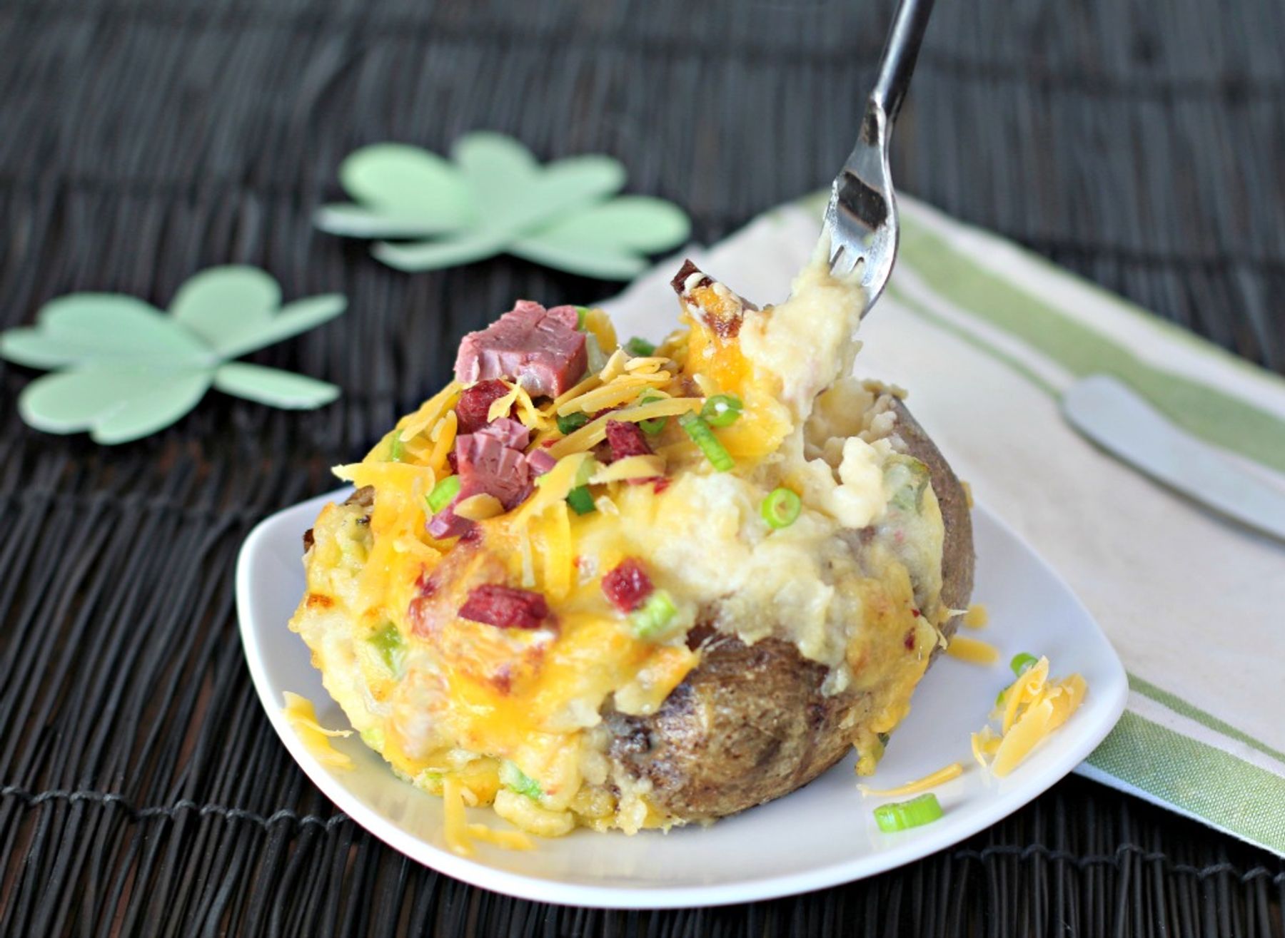 Irish Twice Stuffed Potato is the ultimate in cheesy, creamy, buttery goodness. The crispy potato shell bursts with a meaty stuffing to make this one delicious meal that will send you over the pot of gold!