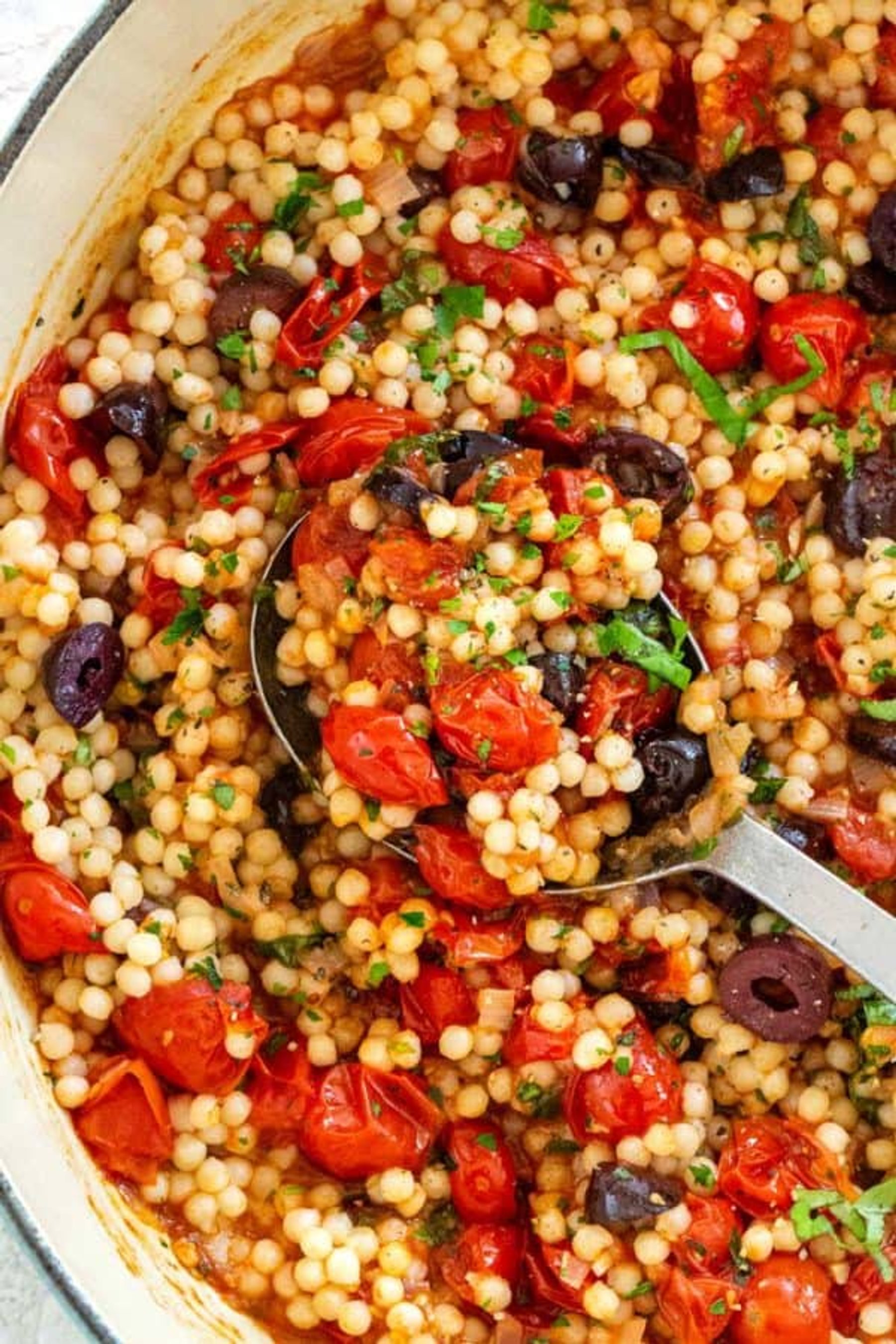 Israeli couscous with tomato and olives is an easy side dish bursting with savory flavors. Chewy pearl couscous is simmered on the stovetop until tender then tossed in a Mediterranean-inspired