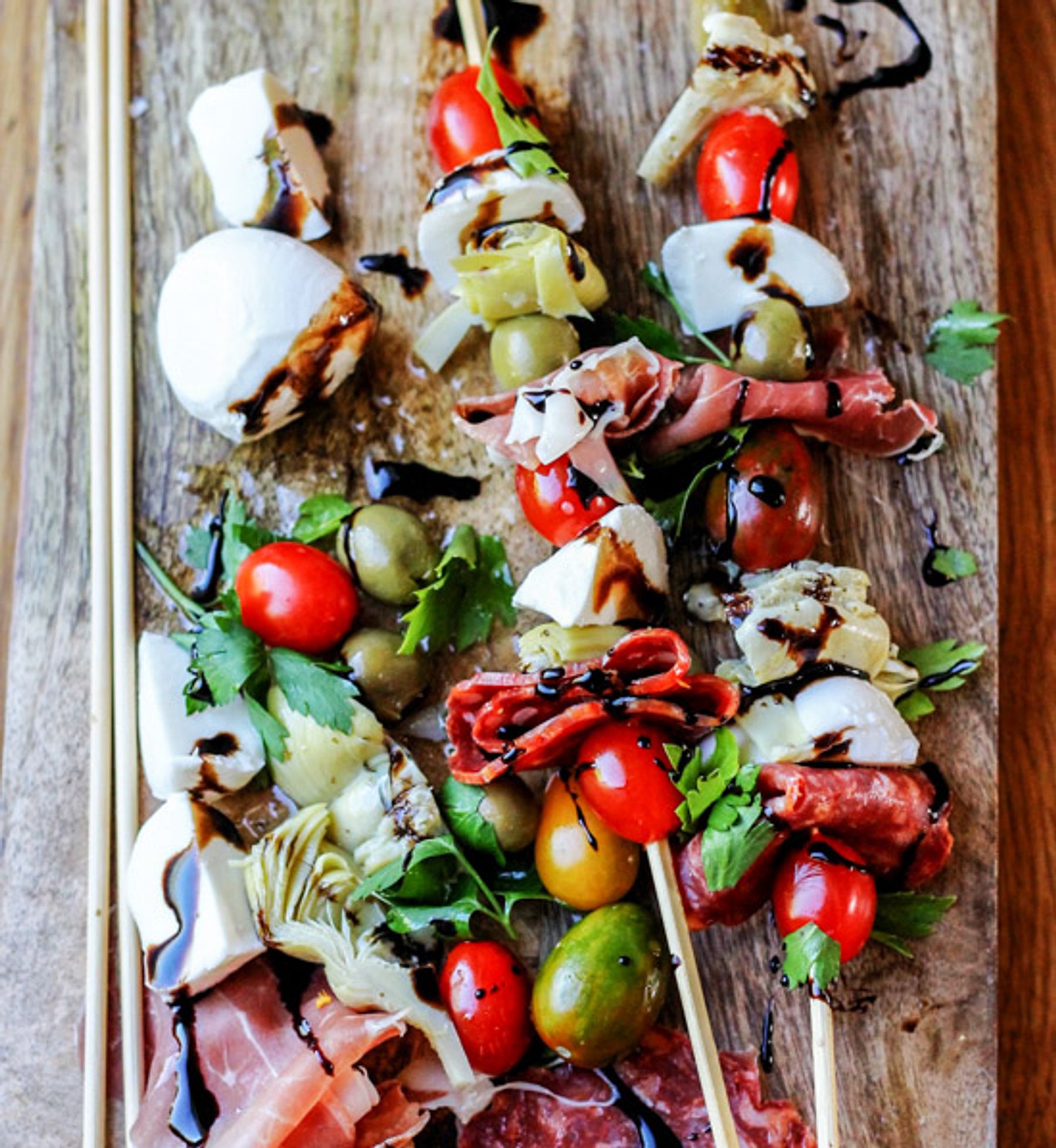 Italian Antipasto Skewers are perfect little bites of traditional Italian appetizer on a stick. Delicious combination of cured meats, mozzarella balls, marinated artichoke hearts, cherry tomatoes and olives drizzled with the balsamic reduction makes for one awesome crowd pleaser.