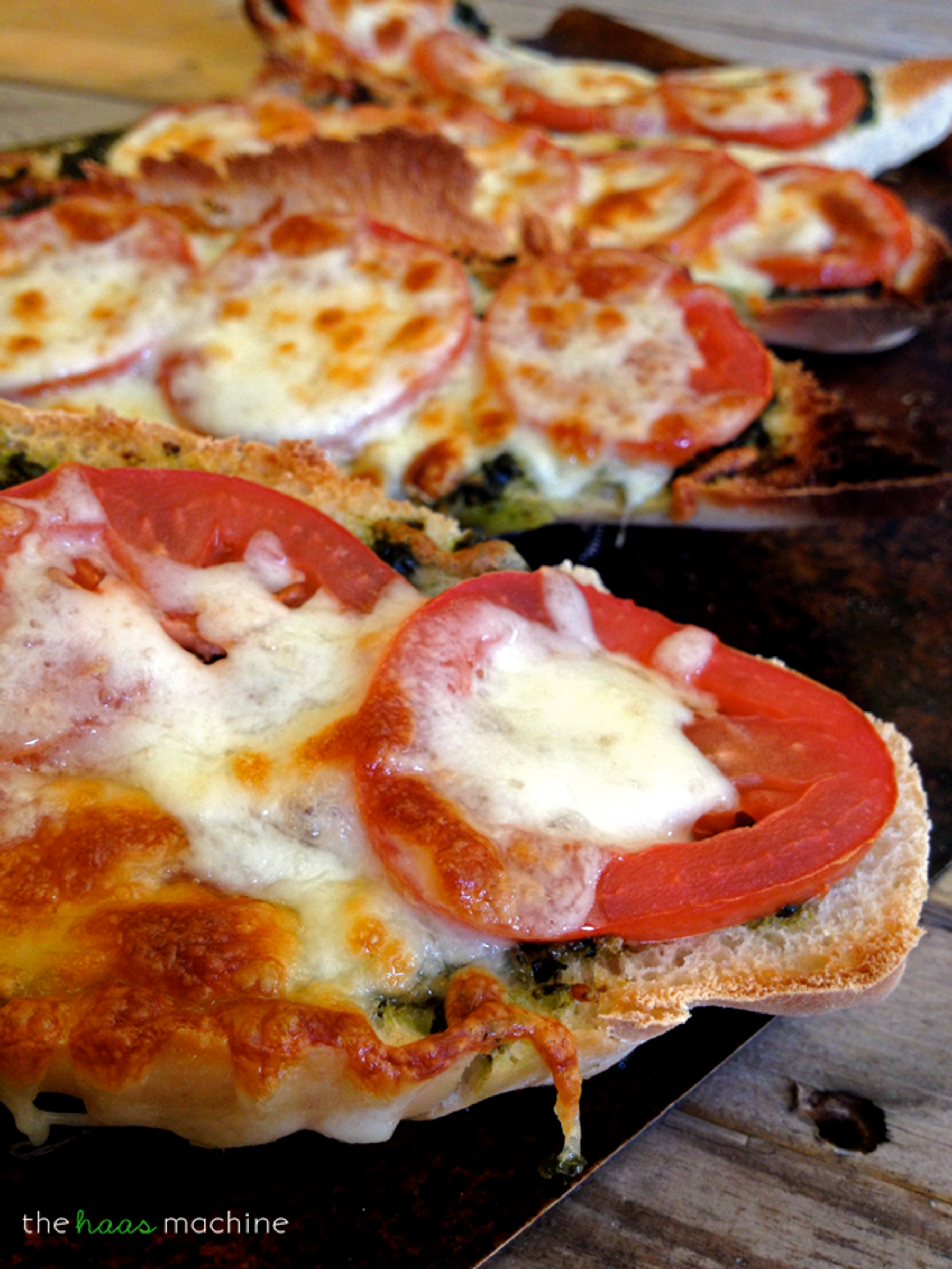 Preheat your broiler to low & prepare a baking sheet with aluminum foil. On the Italian bread, evenly spread the pesto with a spoon. Follow with the tomatoes & then sprinkle on the cheese. Put the pizza in...