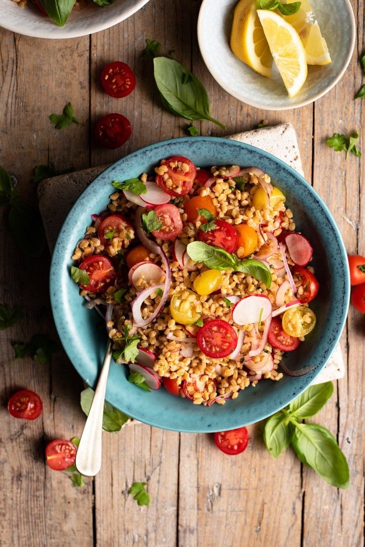 An Italian Farro Salad made with juicy and sweet cherry tomatoes, peppery radishes, fragrant fresh herbs, and a zingy vinaigrette. This feel-good salad is great for eating outdoors, as a packed lunch or a healthy side dish and couldn't be simpler to make!