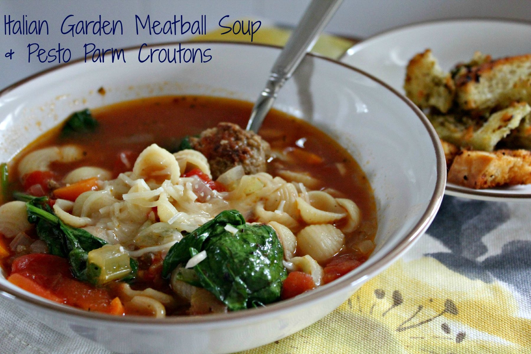 Italian Garden Meatball Soup & Pesto Parm Croutons