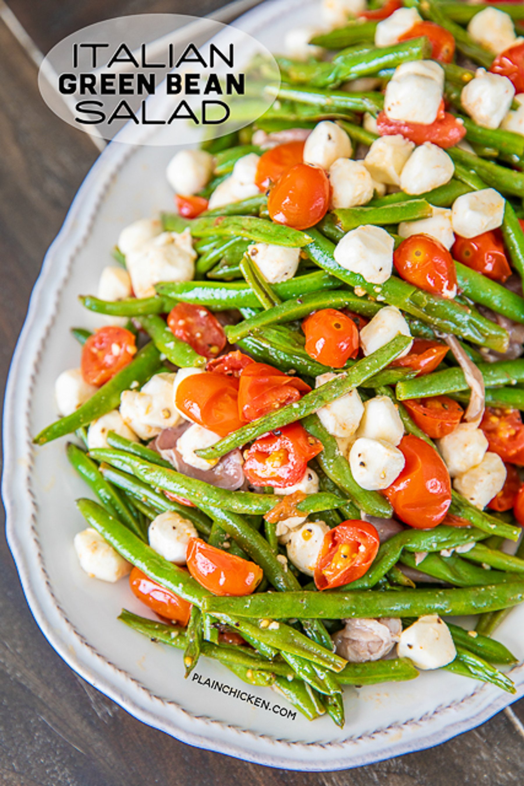 Italian Green Bean Salad - quick and delicious side dish! Green beans, tomatoes, garlic, olive oil, prosciutto, and mozzarella tossed in lemon juice and olive oil. Can serve hot or cold. Great for potlucks and cookouts. Can make in advance and refrigerate until ready to serve. Everyone always asks for the recipe! YUM! #salad #greenbeans #vegetable