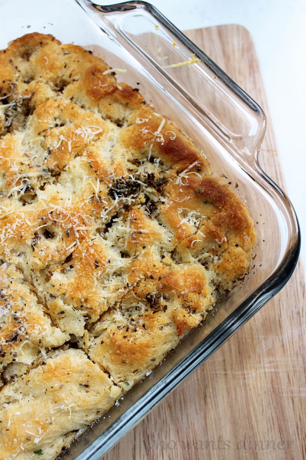 This bread is just divine. I love the chewy texture, the infusion of herbs and the crisp and flakey golden top. It's delicious when paired with your favorite pasta dish or dipped in marinara sauce.