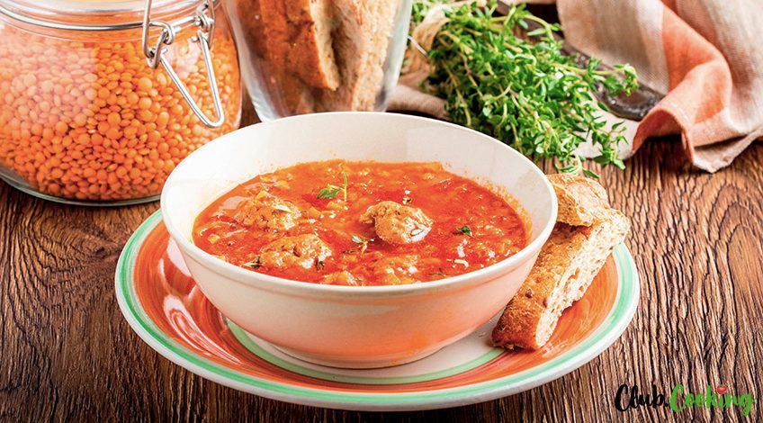 Vegetables and meatballs are slowly cooked in light savory tomato broth for hours melding all the flavors together.