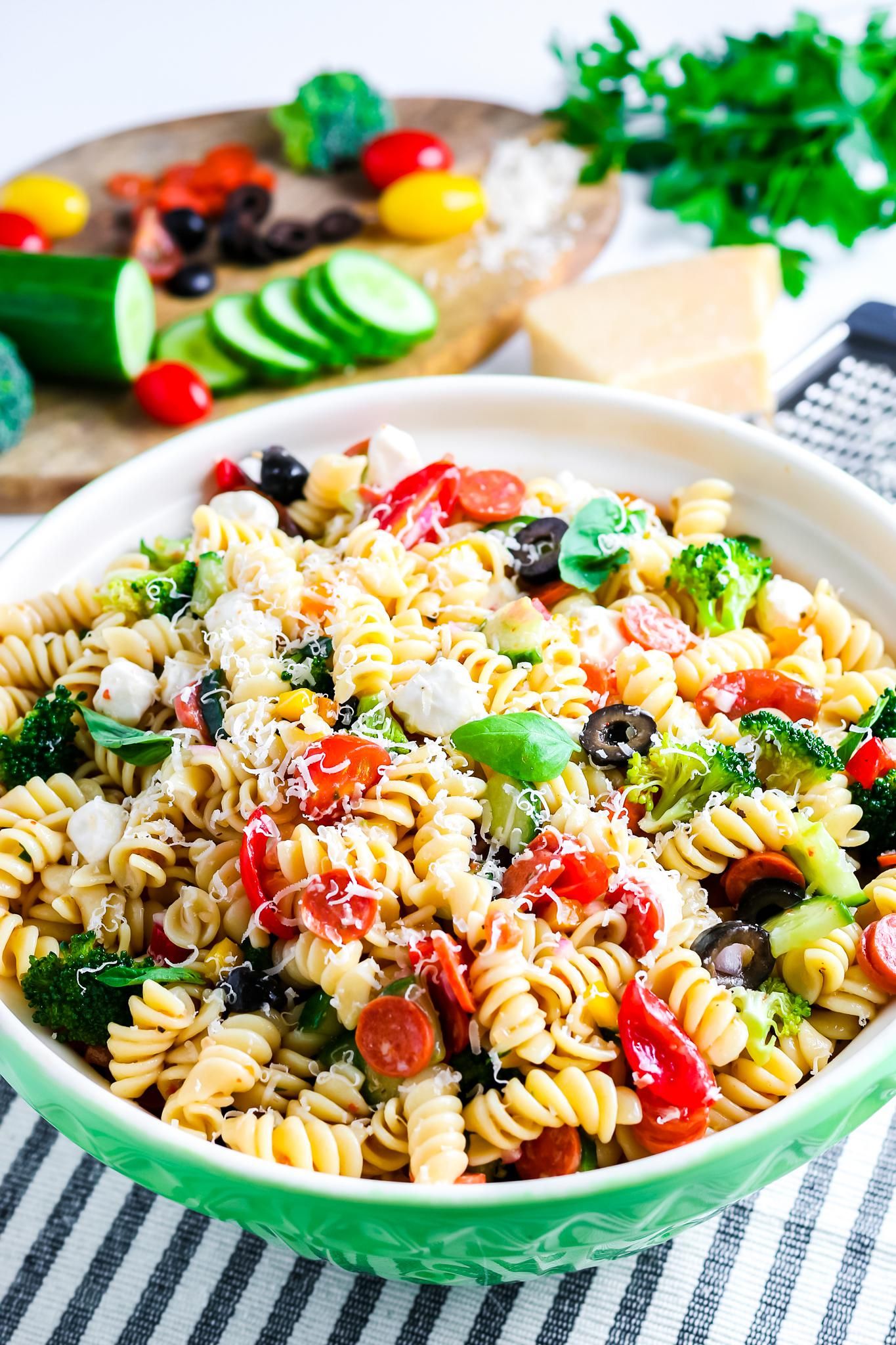 This quick and easy classic Italian Pasta Salad is the perfect side to share. Pasta is tossed with Italian dressing, crunchy vegetables and yummy Italian flavors for this delicious dish. This is the perfect make ahead dish when you pan to fire up the grill for dinner, or have the leftovers for an delicious lunch.