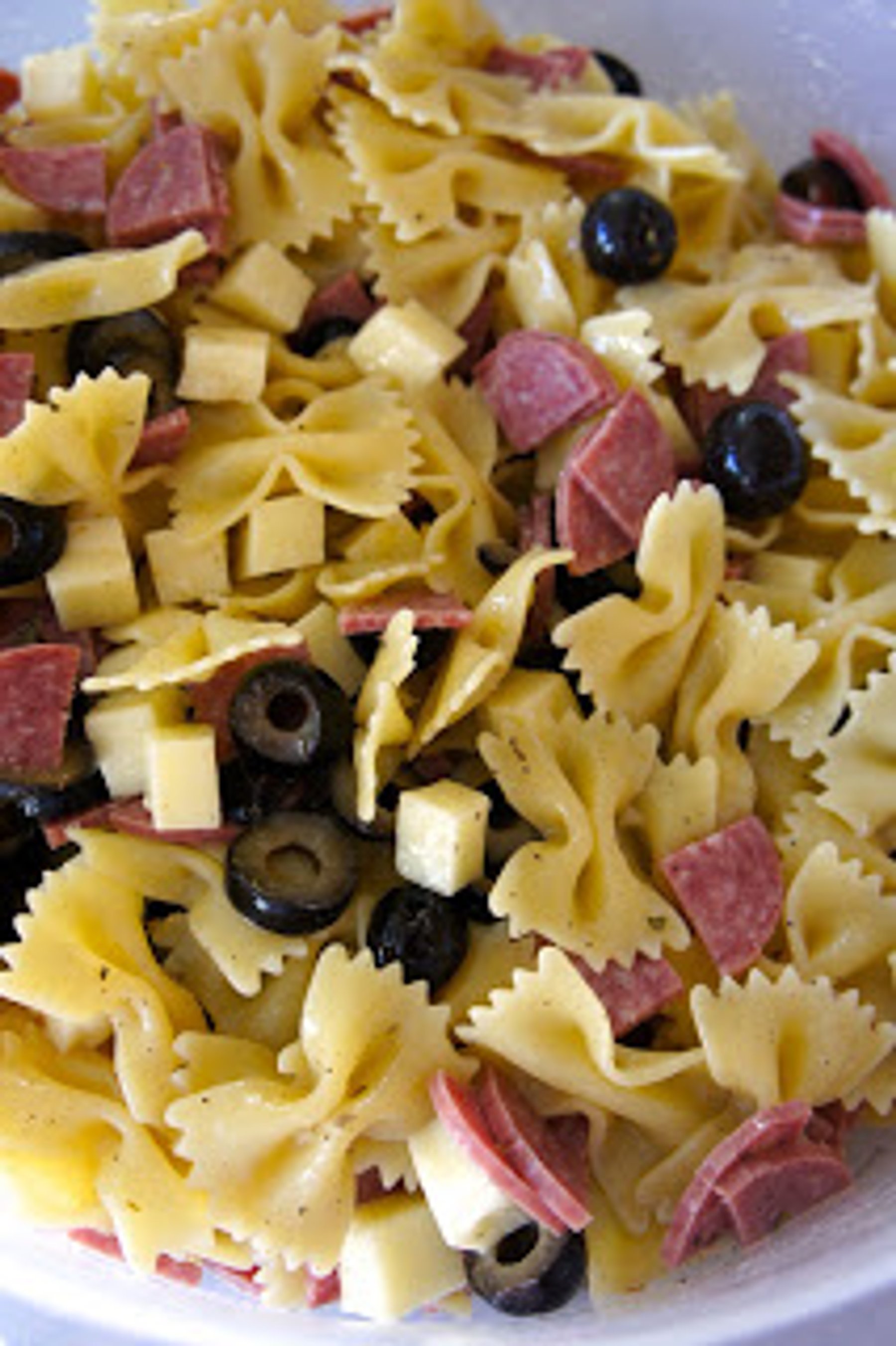 In a large bowl combine the cooled pasta, salami, mozzarella cheese and olives.