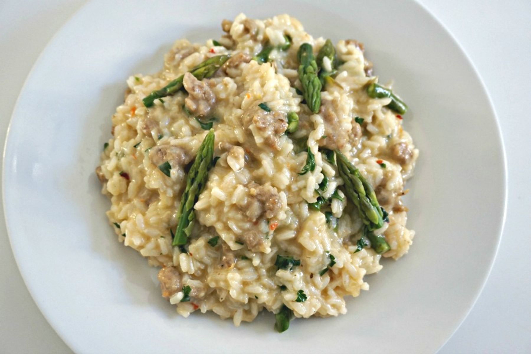 Italian sausage and asparagus risotto. Classic Italian comfort food with creamy rice, cheese and savory Italian sausage.