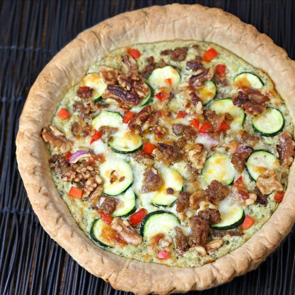 Italian Sausage Ricotta Pesto Pie is an easy and delicious Italian dinner that’s a little bit different from the usual fare with layers of cheeses, sausage and sautéed veggies!